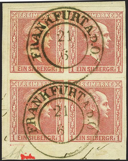 | Zusatzinformationen und Suchstichworte: | 379. Auktion Heinrich Köhler 19. - 24. September 2022 Los 184 1 Silbergroschen dunkelrosa im Viererblock, schöne tiefe Farbe und voll-bis breitrandig, mit paarweise klar aufgesetztem vorphilatelistischen Doppelkreisstempel "FRANKFURT A.D.O. 21 6" auf kleinem Briefstück. Die rechte untere Marke unten rechts zwei sich kreuzende Vortrennschnitte und dort etwas ausgebessert, sonst einwandfrei. Eine recht seltene Einheit in sehr attraktiver Erhaltung. Signiert Drahn und Fotobefund Jäschke-L. BPP Ausruf 200,00 EUR Zuschlag 320,00 EUR (aus der Sammlung Erivan Haub) |