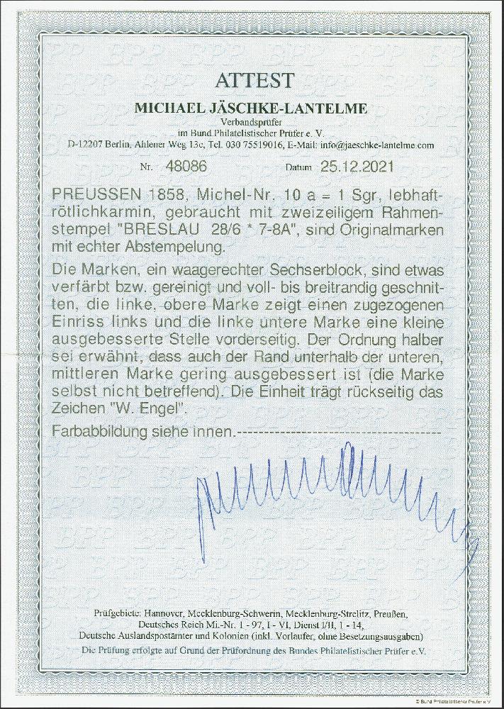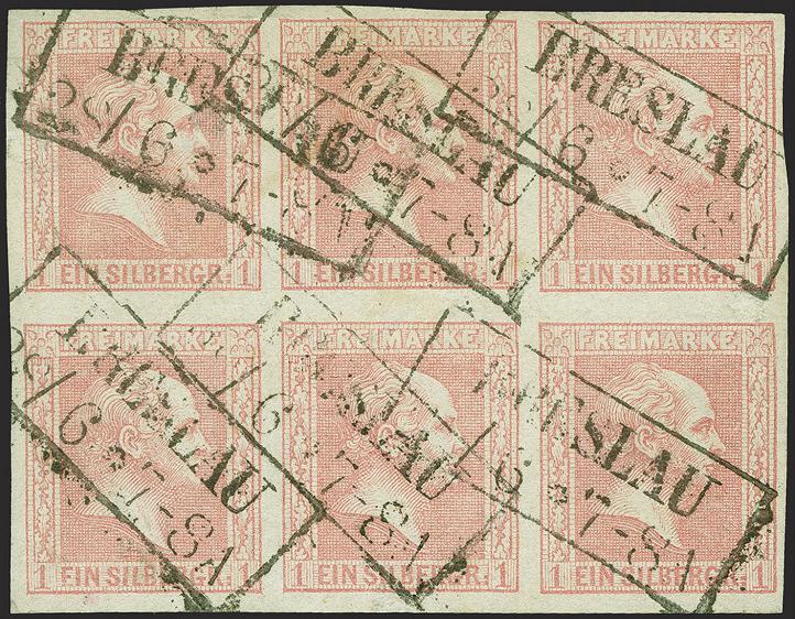 | Zusatzinformationen und Suchstichworte: | 379. Auktion Heinrich Köhler 19. - 24. September 2022 Los 186 1 Silbergroschen rosa im 6er-Block, voll-bis breitrandig, mit mehrfach aufgesetztem Rahmenstempel "BRESLAU 28/6". Die Einheit wurde gereinigt, die Farbe dadurch leicht verblasst, zwei Werte mit zugezogenem Einriss bzw. kleiner ausgebesserter Stelle, sonst einwandfrei. Eine sehr seltener Block. Fotoattest Jäschke-L. BPP (2022) Ausruf 200,00 EUR Zuschlag 300,00 EUR (aus der Sammlung Erivan Haub) |