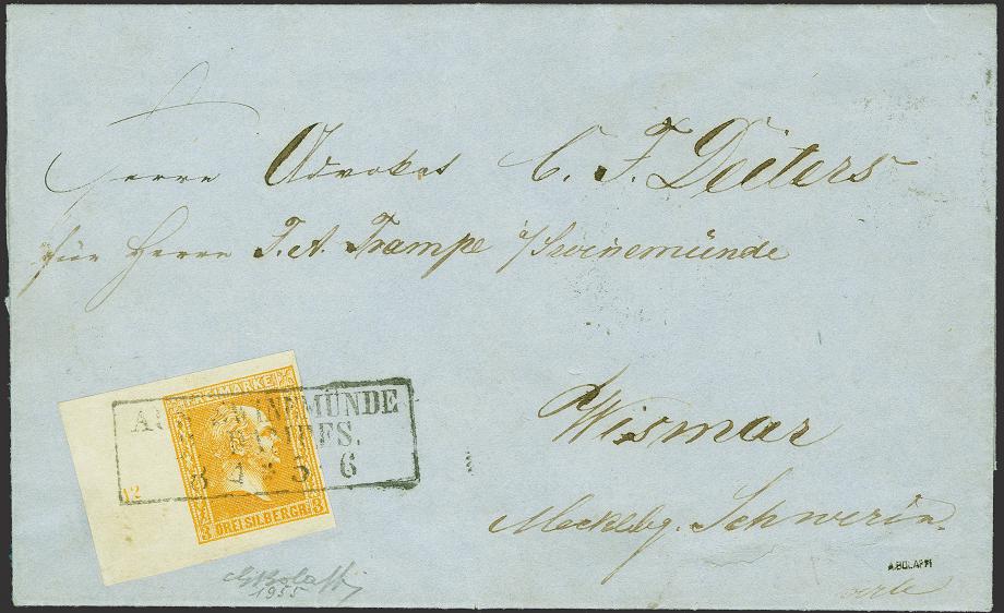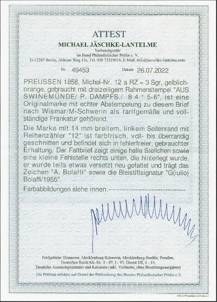 | Zusatzinformationen und Suchstichworte: | 379. Auktion Heinrich Köhler 19. - 24. September 2022 Los 190 3 Silbergroschen gelblichorange, farbfrisch und voll- bis sehr breitrandig, links mit ca. 14 mm Bogenrand mit Reihenzähler "12", mit sauber aufgesetztem Rahmenstempel "AUS SWINEMÜNDE P. DAMPFS. 8 4" auf komplettem Faltbrief nach Wismar. Das Briefpapier mit kleinen Beanstandungen, sonst tadellose und sehr schöne Erhaltung. Ein bemerkenswerter Brief. Signiert A. Bolaffi und Giulio Bolaffi, Fotoattest Jäschke-L. BPP (2022) Ausruf 500,00 EUR Zuschlag 1.450,00 EUR (aus der Sammlung Erivan Haub) |
