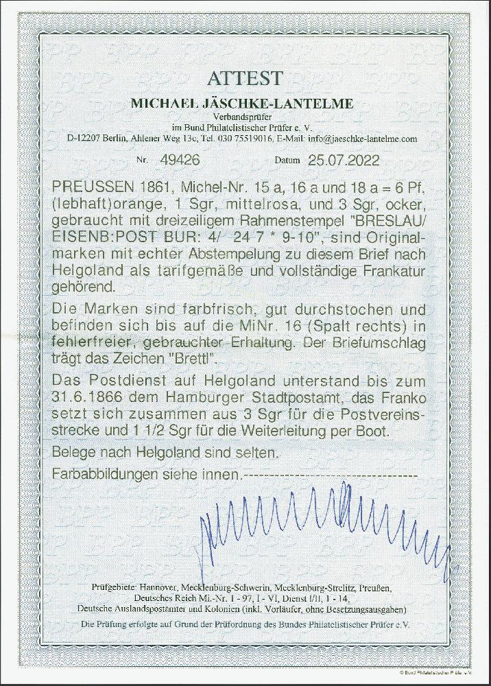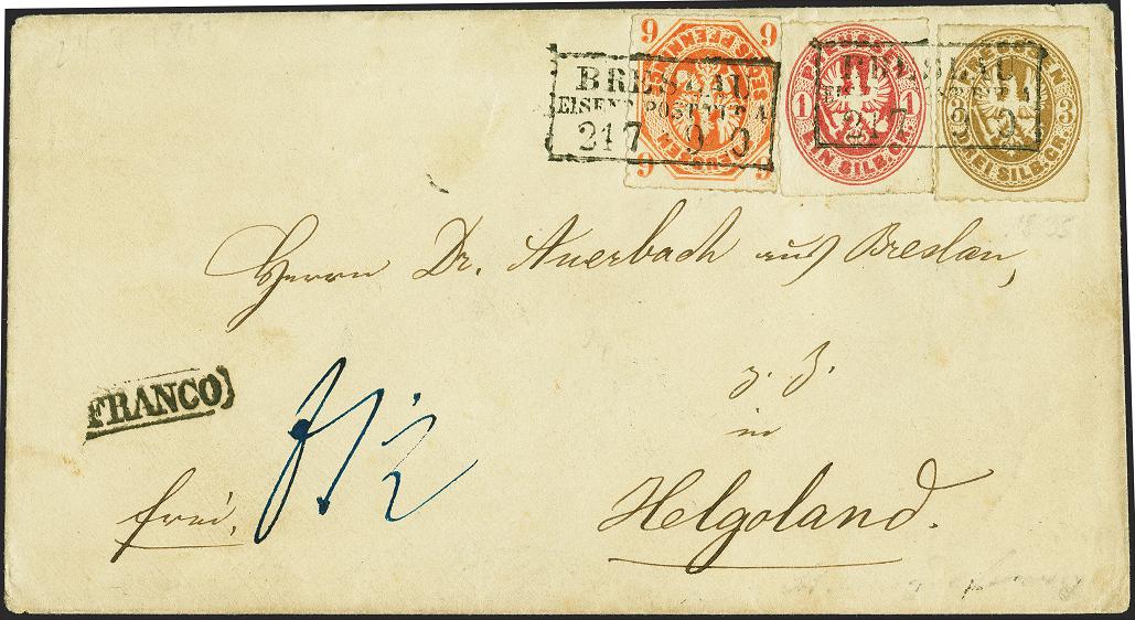 | Zusatzinformationen und Suchstichworte: | 379. Auktion Heinrich Köhler 19. - 24. September 2022 Los 196 Wappen 6 Pfennige orange, 1 Silbergroschen rosa und 3 Silbergroschen ocker, farbfrisch und gut durchstochen, mit sauber aufgesetztem Rahmenstempel "BRESLAU EISENB:POST BUR:4 24/7", nach Helgoland mit Durchgangsstempeln des Preußischen- und Stadt-Postamtes von Hamburg. Die 1 Silbergroschen kleiner Randspalt, sonst einwandfreie Erhaltung. Ein attraktiver Brief mit sehr seltener Destination. Fotoattest Jäschke-L. BPP Ausruf 1.000,00 EUR Zuschlag 2.500,00 EUR (aus der Sammlung Erivan Haub) |
