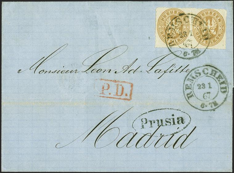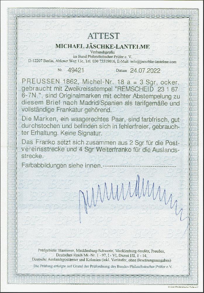 | Zusatzinformationen und Suchstichworte: | 379. Auktion Heinrich Köhler 19. - 24. September 2022 Los 210 1861/65, 3 Silbergroschen ocker im waagerechten Paar,, farbfrisch und gut durchstochen, mit sauber auf- und nebengesetztem blauen Doppelkreisstempel "REMSCHEID 23 1 67" auf Briefhülle mit nebengesetztem Ovalstempel "Prusia" nach Madrid, befördert im geschlossenen Briefpaket über Aachen. Nach dem neuen Postvertrag von 1864 betrug das Porto 6 Silbergroschen pro ½ Loth. Schöne und einwandfreie Erhaltung. Fotoattest Jäschke-L. BPP (2022) Ausruf 150,00 EUR Zuschlag 500,00 EUR (aus der Sammlung Erivan Haub) |