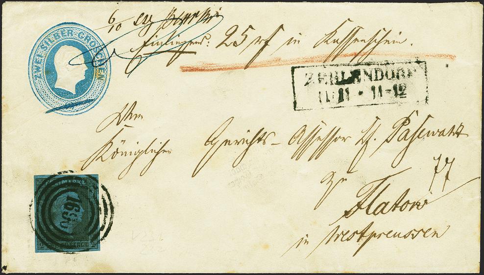 | Zusatzinformationen und Suchstichworte: | 379. Auktion Heinrich Köhler 19. - 24. September 2022 Los 217 Umschlag 2 Sgr. blau, Schilling-Nr. 2, mit Zufrankatur 1850, 2 Silbergroschen schwarz auf blau, farbfrisch und voll- bis breitrandig mit zentrischer Nr."1696" und nebengesetztem Rahmenstempel "ZEHLENDORF 11/11" als Wertbrief nach Flatow in Westpreußen. Rückseitig etwas rau geöffnet, sonst einwandfreie und schöne Erhaltung. Ein außerordentlich seltener Nummernstempel, nur wenige Ganzstücke bekannt. Signiert Kastaun und Fotoattest Jäschke-L. BPP (2022) Ausruf 800,00 EUR Zuschlag 850,00 EUR (aus der Sammlung Erivan Haub) |