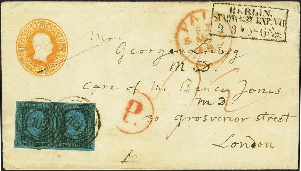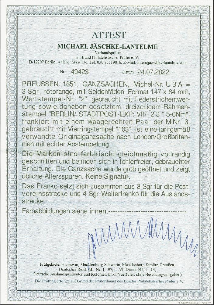 | Zusatzinformationen und Suchstichworte: | 379. Auktion Heinrich Köhler 19. - 24. September 2022 Los 218 Umschlag 3 Sgr. blau, Schilling-Nr. 2, mit Zufrankatur 1850, 2 Silbergroschen schwarz auf blau im waagerechten Paar, farbfrisch und voll- bis breitrandig mit zentrischer Nr."103" und nebengesetztem Rahmenstempel "BERLIN STADTPOST-EXP.VII 2/3" nach London. Schöne einwandfreie Erhaltung, Fotoattest Jäschke-L. BPP (2022) Ausruf 200,00 EUR Zuschlag 950,00 EUR (aus der Sammlung Erivan Haub) |
