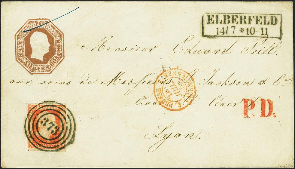 | Zusatzinformationen und Suchstichworte: | 379. Auktion Heinrich Köhler 19. - 24. September 2022 Los 220 1852, Oktogon-Umschlag 4 Silbergroschen rotbraun, Schilling-Nr. 3, mit Zufrankatur 1850, 6 Pfennige rotorange, noch voll- bis breitrandig mit klarem Nummernstempel "373" und nebengesetztem Rahmenstempel "ELBERFELD 14/7" (1855) nach Lyon. Sehr schönes frisches Stück. Signiert Georg Bühler, Kruschel und Metzer, Fotoattest Jäschke-Lantelme BPP (2022) Ausruf 400,00 EUR Zuschlag 900,00 EUR (aus der Sammlung Erivan Haub) |