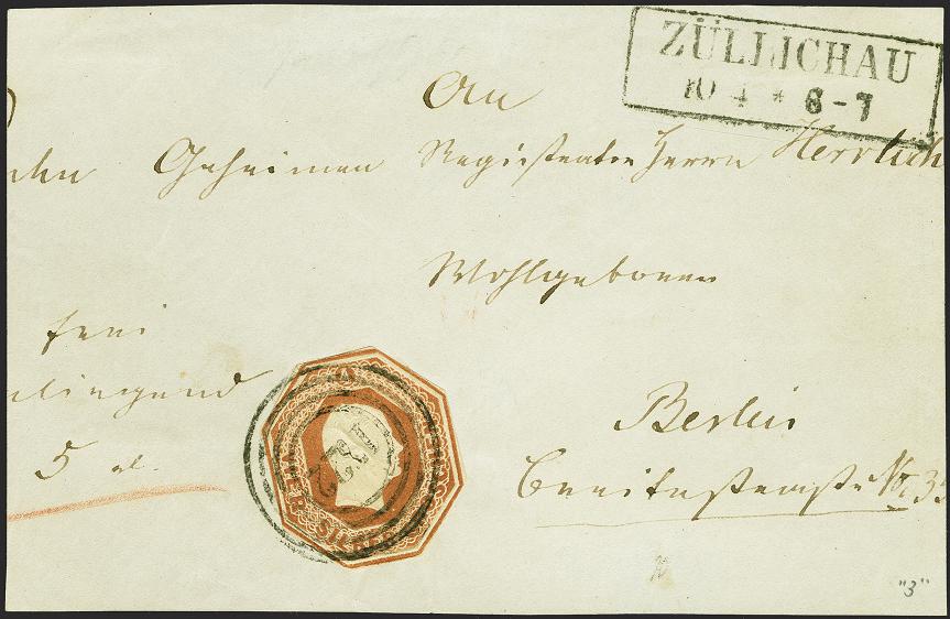 | Zusatzinformationen und Suchstichworte: | 379. Auktion Heinrich Köhler 19. - 24. September 2022 Los 222 1857, Oktogon Ganzsachenausschnitt 4 Silbergroschen dunkelorangebraun ohne Seidenfäden aus dem Umschlag mit Überdruck, Schilling-Nr. "3", achteckig geschnitten, mit Nr. "1722" auf fast vollständiger Briefvorderseite eines Wertbriefes von "ZÜLLICHAU 10 4" nach Berlin. Schöne und einwandfreie Erhaltung. Von diesem Ganzsachenausschnitt sind nur noch zwei kleine Briefstücke registriert. Ein vollständiger Brief ist bis heute nicht bekannt geworden. Eine der großen Seltenheiten der preußischen Ganzsachen. Signiert Meyer BPP und Fotoattest Jäschke-Lantelme BPP (2022) Ausruf 5.000,00 EUR Zuschlag 5.000,00 EUR (aus der Sammlung Erivan Haub) |