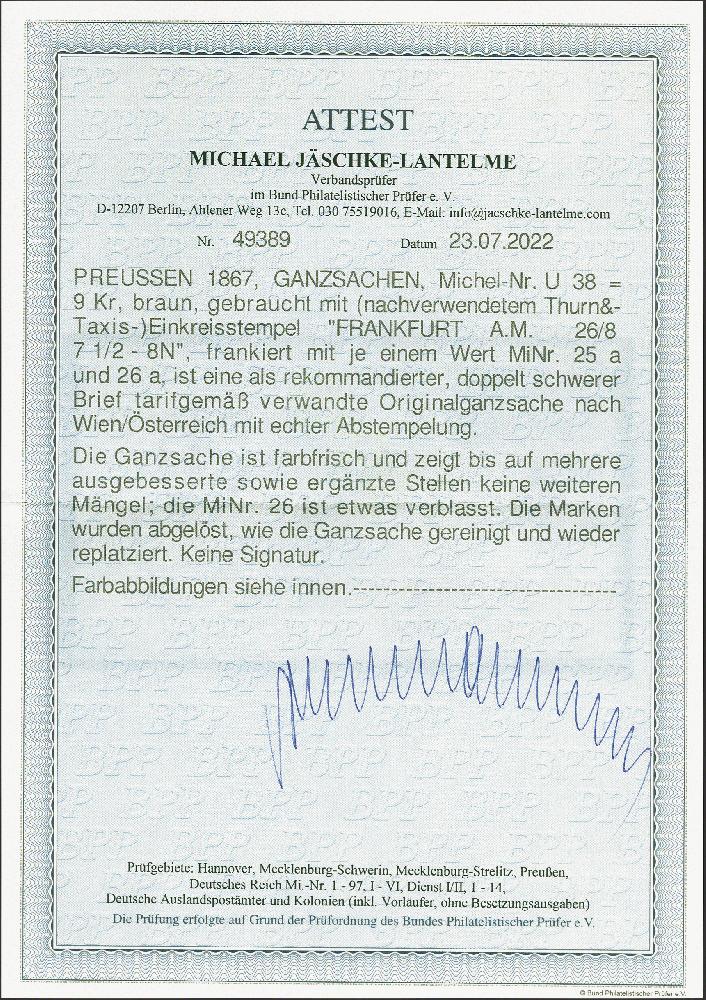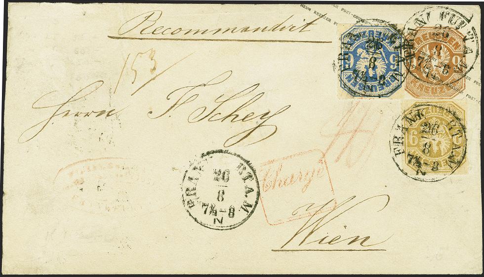 | Zusatzinformationen und Suchstichworte: | 379. Auktion Heinrich Köhler 19. - 24. September 2022 Los 247 1867, Umschlag 9 Kreuzer braun mit Zufrankatur 6 Kreuzer ultramarin und 9 Kreuzer ocker, letztere etwas blass, sonst farbfrisch und beide gut durchstochen, mit Einkreisstempel "FRANKFURT A. M. 26/8" als Chargé -Brief der 2.Gewichtsstufe nach Wien. Die Ganzsache mit einigen gehobenen Papiermängeln und gereinigt, sonst einwandfrei. Fotoattest Jäschke-Lantelme BPP (2022) Ausruf 400,00 EUR (aus der Sammlung Erivan Haub) |
