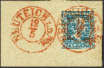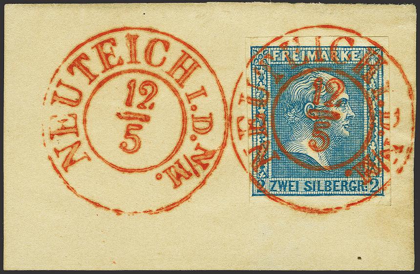 | Zusatzinformationen und Suchstichworte: | 379. Auktion Heinrich Köhler 19. - 24. September 2022 Los 250 "NEUTEICH I.D. N/M. 12/5", leuchtend roter Doppelkreisstempel, sauber auf- und nebengesetzt auf Gittergrund 2 Silbergroschen ultramarin, farbfrisch und voll- bis meist breitrandig, auf kleinem Briefstück. Zwei winzige Randspalte, einer außerhalb des Markenbildes, sonst Sehr schöne frische und tadellose Erhaltung. Ein wunderschönes Stück des seltenen Stempels, der auf der Kopfausgabe nur in wenigen Exemplaren belegt ist. Fotoattest Brettl BPP (1994) und Dr. Brinkmann BPP (1992) Ausruf 1000,00 EUR Zuschlag 6.000,00 EUR (aus der Sammlung Erivan Haub) |