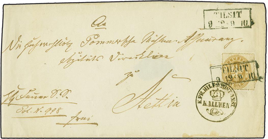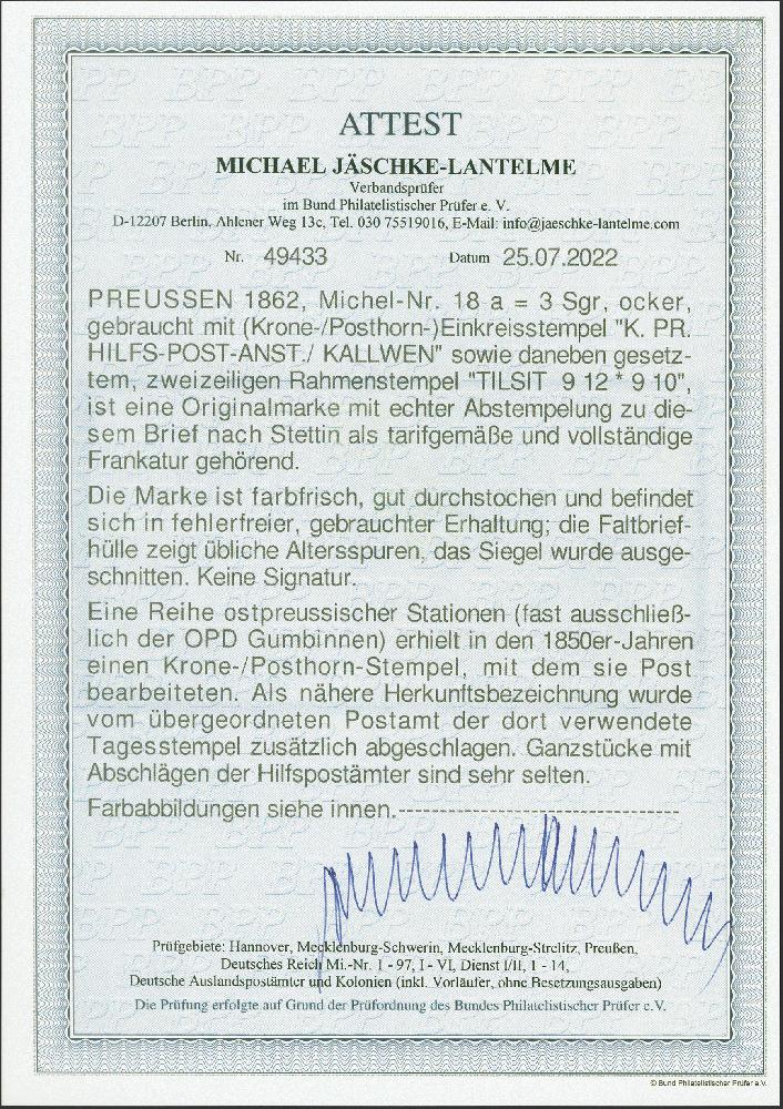 | Zusatzinformationen und Suchstichworte: | 379. Auktion Heinrich Köhler 19. - 24. September 2022 Los 253 "K.PR.HILFSPOST-ANST. KALLWEN", Krone-Posthorn-Stempel der Hilfspostanstalt, sauber und leicht übergehend auf Wappen 3 Silbergroschen ocker, zusätzlich entwertet mit sauber auf- und nebengesetztem Rahmenstempel der vorgesetzten Postexpedition "TILSIT 9 12" auf Briefhülle (2 Seitenklappen fehlend) nach Stettin. Ein attraktiver und seltener Brief. Fotoattest Jäschke-L. BPP (2022) Ausruf 1.000,00 EUR Zuschlag 2.100,00 EUR (aus der Sammlung Erivan Haub) |
