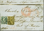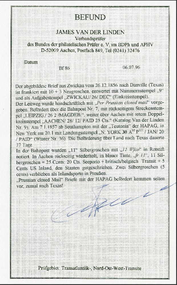 | Zusatzinformationen und Suchstichworte: | 379. Auktion Heinrich Köhler 19. - 24. September 2022 Los 264 3 Neugroschen auf gelb zusammen mit 10 Neugroschen cyanblau, beide voll- bis breitrandig, mit Nr. "9" auf Briefhülle von Zwickau 1856 nach Danville, Texas, befördert über die 'Prussian closed mail', ab Southampton mit der 'Teutonia' der Hapag. Die Frankatur war gelöst, Mängel sind bis auf eine leichte Verfärbung der 10 Neugroschen nicht feststellbar. Fotoattest Vaatz BPP (2022) Ausruf 500,00 EUR Zuschlag 650,00 EUR (aus der Sammlung Erivan Haub) |