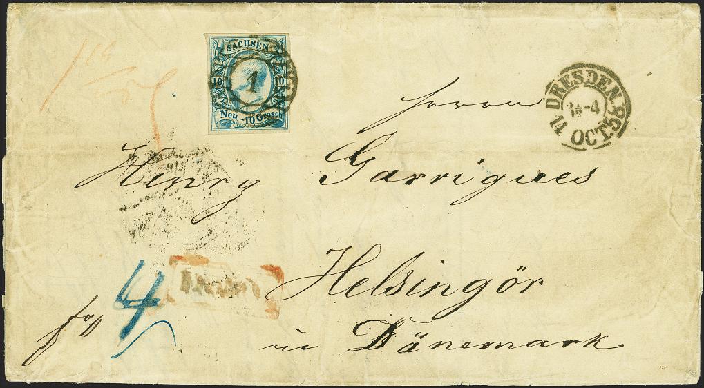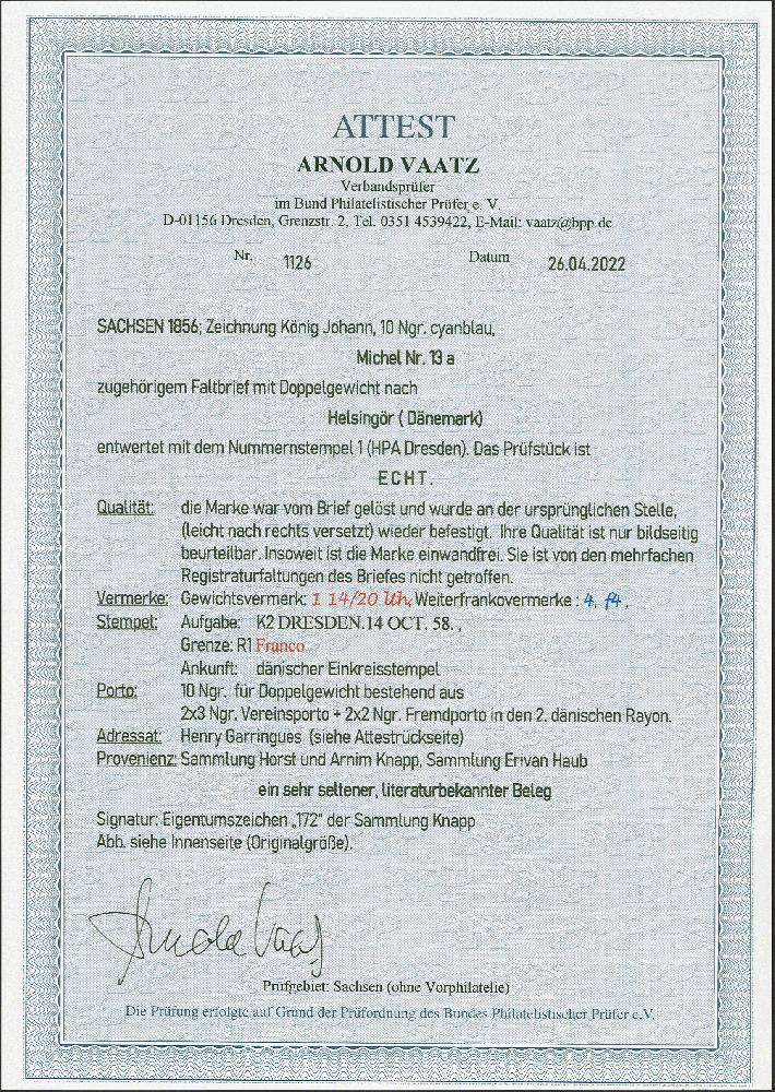 | Zusatzinformationen und Suchstichworte: | 379. Auktion Heinrich Köhler 19. - 24. September 2022 Los 266 10 Neugroschen cyanblau, allseits breitrandig, mit zentrisch klarer Nr. "1" auf komplettem Faltbrief der 2. Gewichtsstufe von "DRESDEN 14 OCT. 58" nach Helsingör im 2. dänischen Rayon. Das Porto setzt sich zusammen aus 6 Neugroschen Vereinsporto und 4 Neugroschen ausgewiesenem Weiterfranko. Die Marke war gelöst und ist nicht ganz korrekt replatziert; Mängel sind nicht erkennbar. Eine seltene Einzelfrankatur, nach Dänemark ist nur eine weitere registriert. Fotoattest Vaatz BPP (2022) Ausruf 1.000,00 EUR Zuschlag 3.800,00 EUR (aus der Sammlung Erivan Haub) |
