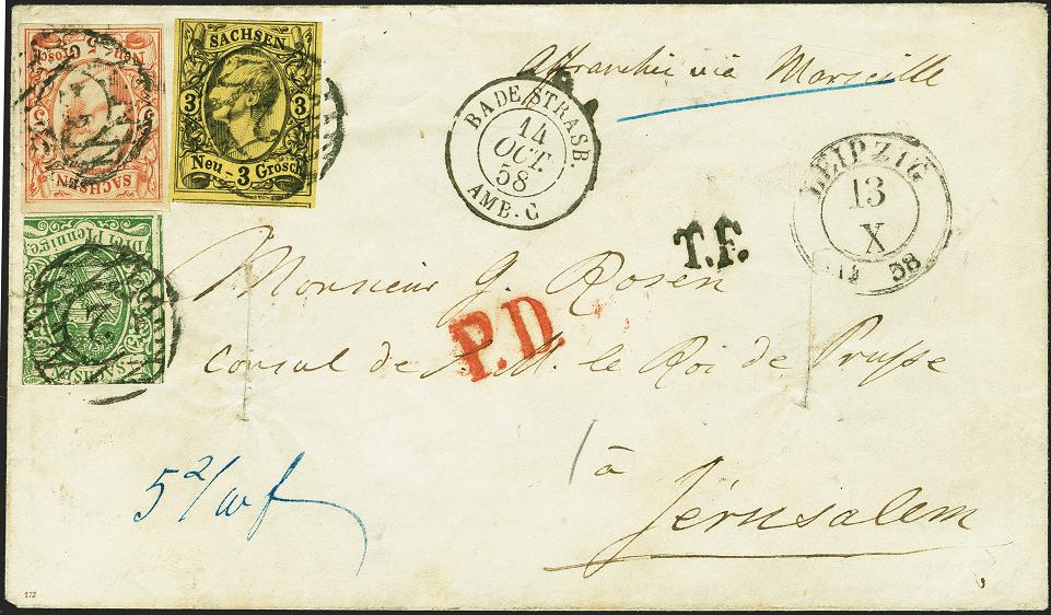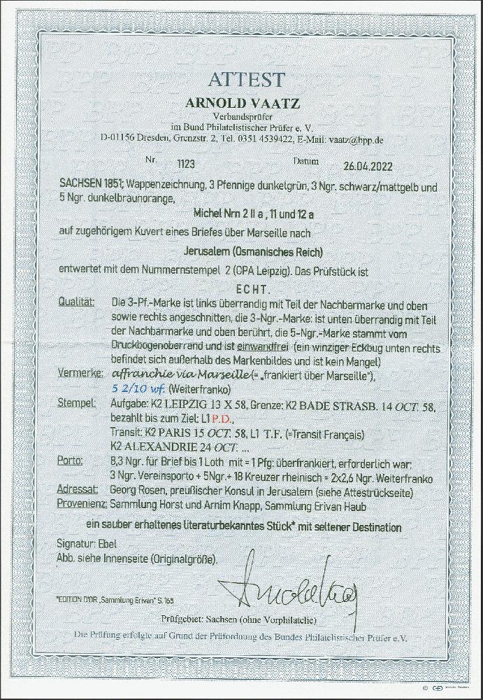 | Zusatzinformationen und Suchstichworte: | 379. Auktion Heinrich Köhler 19. - 24. September 2022 Los 267 5 Neugroschen dunkelbraunorange mit 3 Neugroschen auf mattgelb und Wappen 3 Pfennige dunkelgrün, mit Nr. "2" auf Briefkuvert von "LEIPZIG 13 X 58" über Frankreich und Alexandria an den preußischen Konsul in Jerusalem, Georg Rosen. Die 3 Pfennige Schnittmängel und die 3 Neugroschen leicht berührt, sonst einwandfrei; im Umschlag zwei Räucherschlitze. Das Porto setzt sich zusammen aus 3 Neugroschen Vereins Porto und zweimal 2,6 Neugroschen Weiterfranko. Ein attraktiver und sehr seltener Brief in das heilige Land. Fotoattest BPP (2022) Ausruf 3.000,00 EUR Zuschlag 16.000,00 EUR (aus der Sammlung Erivan Haub) |
