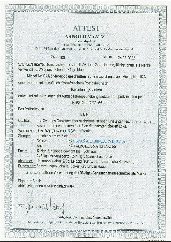 | Zusatzinformationen und Suchstichworte: | 379. Auktion Heinrich Köhler 19. - 24. September 2022 Los 273 1859, Ganzsachenausschnitt 10 Neugroschen grün, viereckig geschnitten, oben und unten leicht berührt, als Zufrankatur auf Ganzsachenumschlag 2 Neugroschen blau, mit sauber auf- und nebengesetztem Doppelkreisstempel "LEIPZIG 9 DEC. 66" als Brief der 2. Gewichtsstufe nach Barcelona. Übliche Öffnungsspuren (im Attest als kleiner Einriss beschrieben) sonst einwandfreie und sehr schöne frische Erhaltung. Ganzsachenausschnitte des 10 Neugroschen-Umschlages sind auf Brief außerordentlich selten; wir haben insgesamt nur 13 Stück registriert, davon keinen weiteren als Zufrankatur auf Ganzsache. Fotoattest Vaatz BPP (2022) Ausruf 3.000,00 EUR Zuschlag 16.000,00 EUR (aus der Sammlung Erivan Haub) |