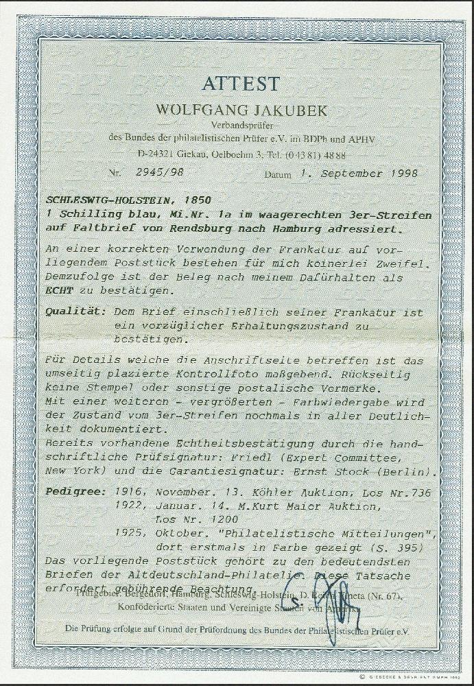| Zusatzinformationen und Suchstichworte: | 379. Auktion Heinrich Köhler 19. - 24. September 2022 Los 274 1850, Wappenausgabe 1 Schilling blau im waagerechten 3er-Streifen, die rechte Marke oben rechts kurz minimal in der Randlinie berührt, sonst allseits voll- bis breitrandig und sehr schön farbfrisch, mit leicht und sauber aufgesetztem Roststempel "34" von Rendsburg, jedoch ohne nebengesetztem Aufgabe-Stempel, auf Brief mit großem Teil des Inhaltes nach Hamburg. Sehr schöne frische und einwandfreie Erhaltung. Gebrauchte Dreierstreifen dieser Marke sind außerordentlich selten, auf Brief haben wir nur einen weiteren registriert. Eine der großen Seltenheiten der Schleswig-Holstein-Philatelie. Signiert Ernst Stock und Friedl, Fotoattest Friedl Expert Committee 1950) und Jakubek BPP (1998) Ausruf 25.000,00 EUR Zuschlag 100.000,00 EUR (aus der Sammlung Erivan Haub) |