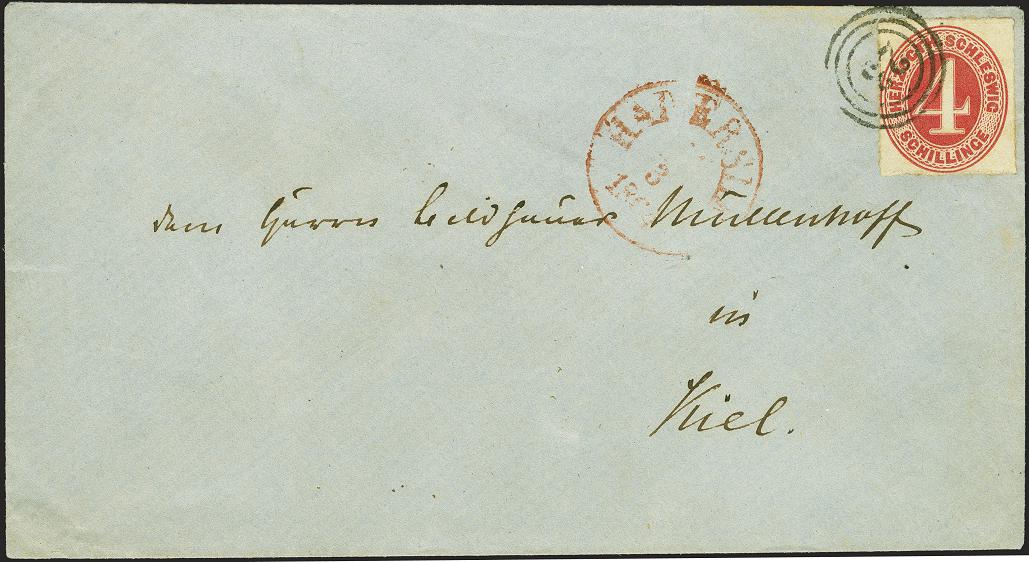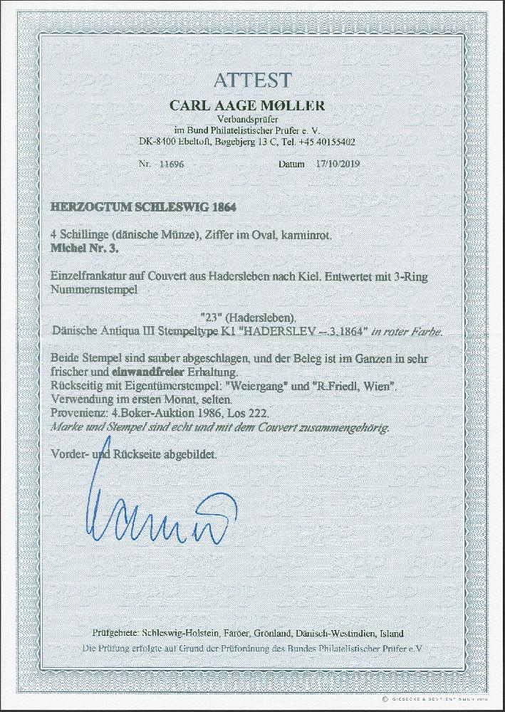| Zusatzinformationen und Suchstichworte: | 379. Auktion Heinrich Köhler 19. - 24. September 2022 Los 275 1864, 4 Schilling karmin rot, farbfrisch und gut durchstochen, mit sauber aufgesetzter Nr. "23" und leicht nebengesetztem roten Einkreisstempel "HADERSLEV .. 3 1864" auf blaugrauem Briefkuvert nach Kiel. Eine attraktive frühe Verwendung (wahrscheinlich 11. oder 14. 3.) in einwandfreier Erhaltung. Private Signatur und signiert Friedl, Wien sowie Fotoattest Moeller BPP (2019) Ausruf 300,00 EUR Zuschlag 1.350,00 EUR (aus der Sammlung Erivan Haub) |