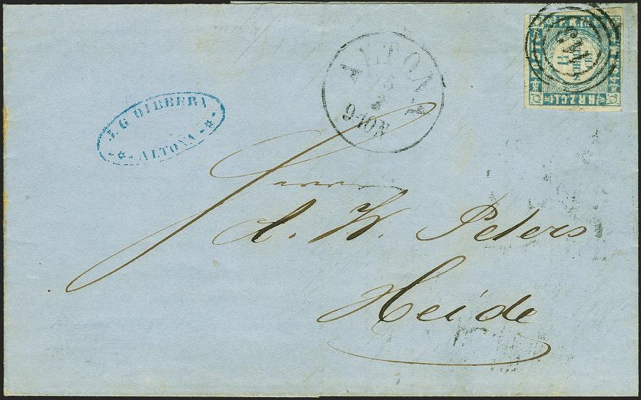 | Zusatzinformationen und Suchstichworte: | 379. Auktion Heinrich Köhler 19. - 24. September 2022 Los 277 1¼ Schilling mit weit gewähltem Grund, farbfrisch und voll-bis breitrandig mit sauber aufgesetzter Nr. "113" und nebengesetztem Einkreisstempel "ALTONA 5/3" (1864) auf komplettem Faltbrief nach Heide mit Ankunftsstempel vom nächsten Tag. Sehr schöne und tadellose Erhaltung. Diese Marke zählt auf Brief zu den Seltenheit der Altdeutschland-Philatelie; wir haben insgesamt nur zwölf Briefe registriert, von denen die meisten in Bezug auf Qualität und Optik weit hinter dem hier angebotenen rangieren. Fotoattest Moeller BPP (2019) Ausruf 30.000,00 EUR (aus der Sammlung Erivan Haub) |
