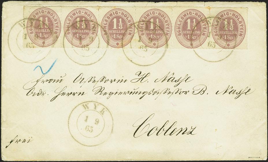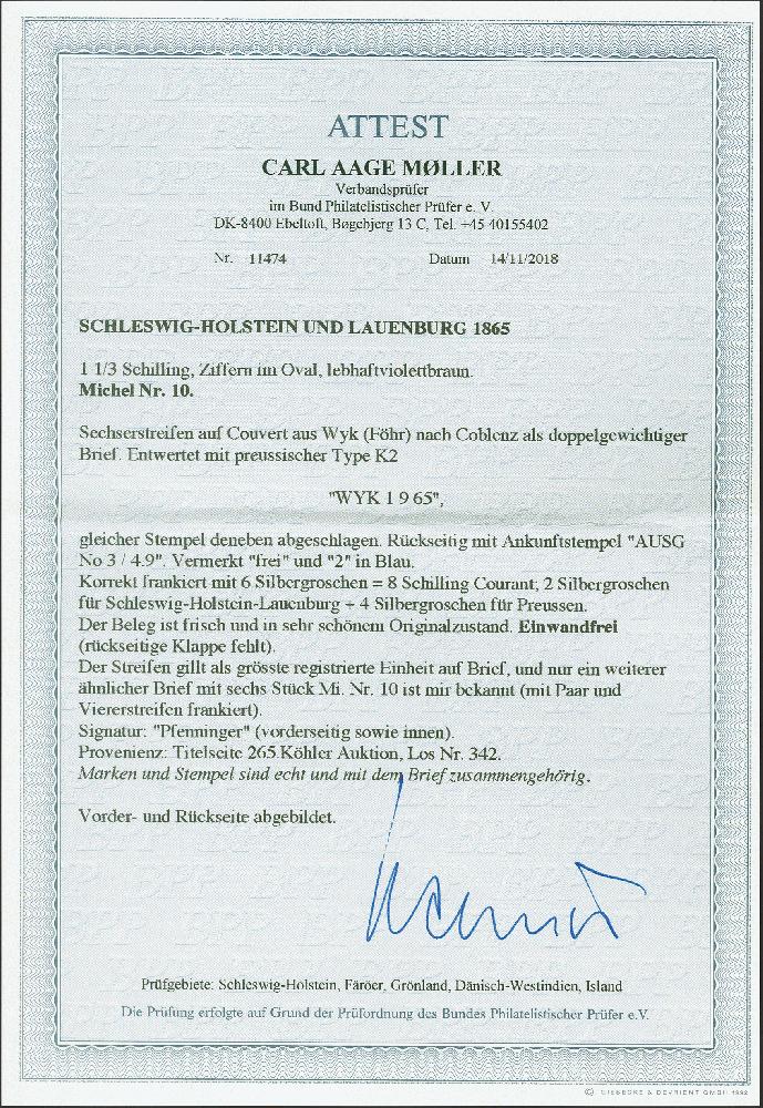 | Zusatzinformationen und Suchstichworte: | 379. Auktion Heinrich Köhler 19. - 24. September 2022 Los 278 SCHLESWI-HOLSTEIN: 1865, 1 ⅓ Schilling lebhaftviolettbraun im waagerechten 6er-Streifen, farbfrisch und gut durchstochen, mit sauber auf- und nebengesetztem Doppelkreisstempel "WYK 1 9 65" auf Briefkuvert der 2. Gewichtsstufe nach Koblenz mit rückseitigem Ausgabestempel. Die rückseitige Verschlussklappe fehlt, sonst bis auf einige minimale Altersfleckchen tadellos. Der 6er-Streifen ist die größte bekannte Einheit dieser Marke; wir haben keinen weiteren registriert. Signiert Pfenninger und Fotoattest Moeller BPP (2018) Ausruf 5.000,00 EUR Zuschlag 17.000,00 EUR (aus der Sammlung Erivan Haub) |
