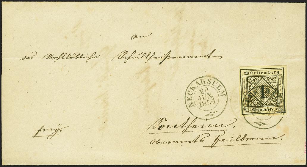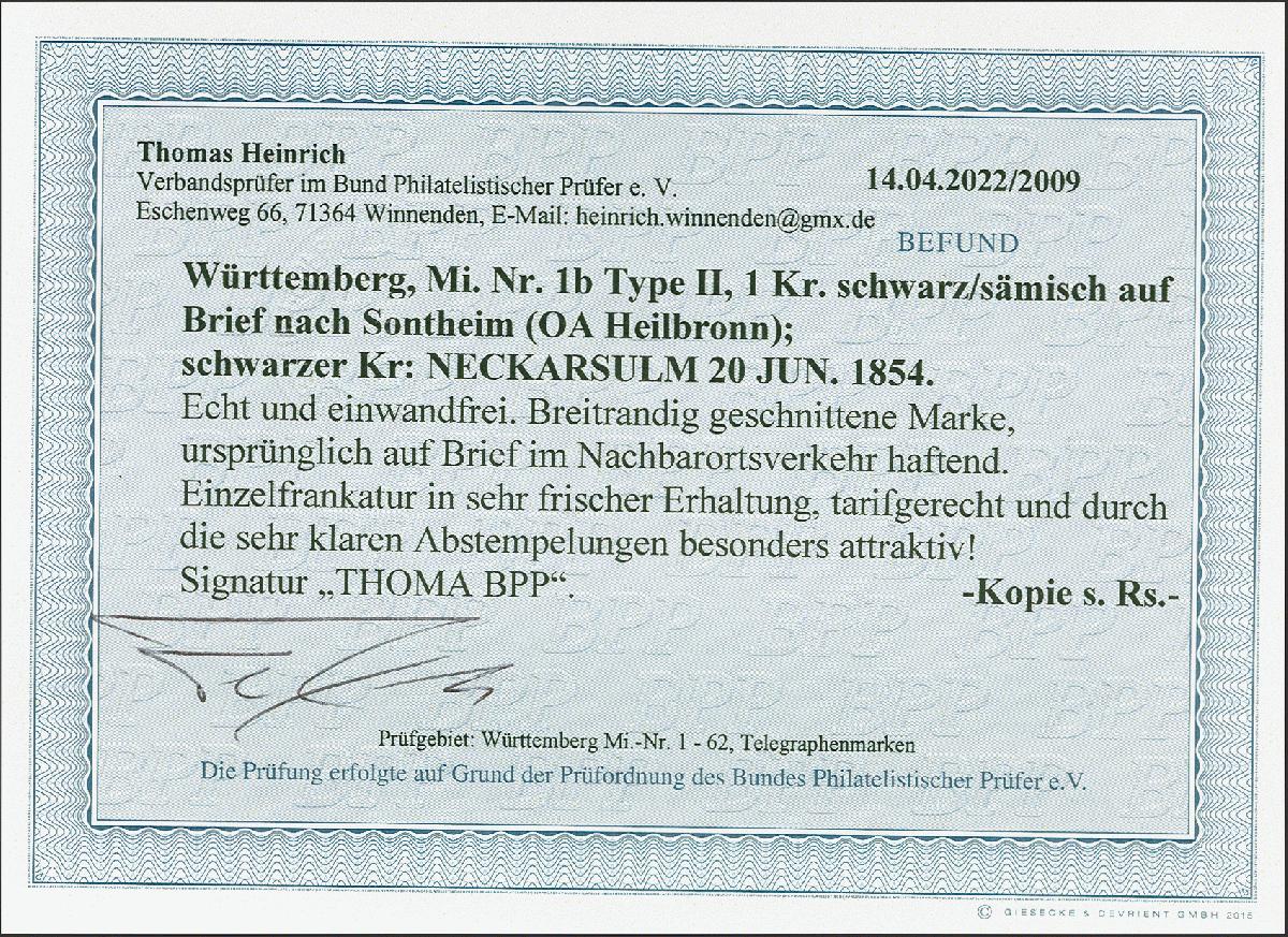 | Zusatzinformationen und Suchstichworte: | 379. Auktion Heinrich Köhler 19. - 24. September 2022 Los 282 1 Kreuzer auf sämisch, farbfrisch und voll- bis breitrandig mit sauber auf- und nebengesetztem Doppelkreisstempel "NECKARSULM 20 JUN. 1854" auf doppelt verwendeter Briefhülle nach Sontheim im Bestellbezirk von Heilbronn. Eine attraktive Einzelfrankatur in einwandfreier Erhaltung. Signiert Thoma BPP und Fotobefund Heinrich BPP Ausruf 100,00 EUR Zuschlag 340,00 EUR (aus der Sammlung Erivan Haub) |