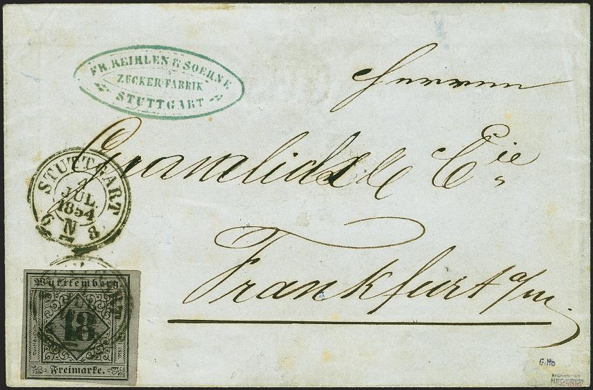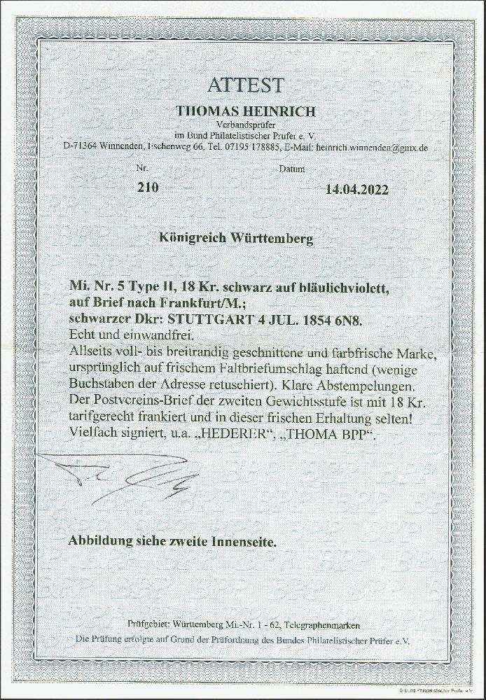 | Zusatzinformationen und Suchstichworte: | 379. Auktion Heinrich Köhler 19. - 24. September 2022 Los 286 18 Kreuzer auf bläulichviolett, farbfrisch und noch voll- bis breitrandig, mit sauber auf- und nebengesetztem Kreisstempel "STUTTGART 4 JUL. 1854" auf Briefhülle der 2. Gewichtsstufe nach Frankfurt am Main. Eine schöne und tadellose Einzelfrankatur in den Postverein. Fotoattest Heinrich BPP (2022) Ausruf 1.000,00 EUR Zuschlag 1.300,00 EUR (aus der Sammlung Erivan Haub) |