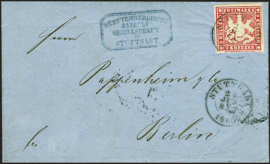 | Zusatzinformationen und Suchstichworte: | 379. Auktion Heinrich Köhler 19. - 24. September 2022 Los 288 9 Kreuzer karmin, sehr schön farbfrisch und mit guter Wappenprägung, voll- bis breitrandig, mit leicht und sauber auf- und nebengesetztem Doppelkreisstempel "STUTTGART 24 JUN. 1860" auf komplettem Faltbrief nach Berlin. Mehrfach signiert und Fotobefund Heinrich BPP Ausruf 100,00 EUR Zuschlag 600,00 EUR (aus der Sammlung Erivan Haub) |