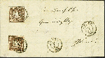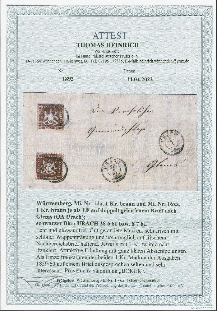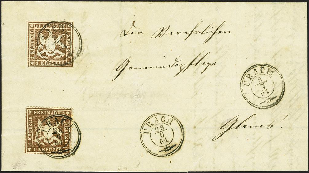 | Zusatzinformationen und Suchstichworte: | 379. Auktion Heinrich Köhler 19. - 24. September 2022 Los 290 1 Kreuzer braun, gezähnt, dünnes Papier, farbfrisch und gut gezähnt, mit sauber auf- und nebengesetztem Kreisstempel "URACH 28 5 NOV. 1861" auf Ortsbrief mit Rechnung einer Buchbinderei an den Gemeindevorsteher und zehn Tage später erneut aufgegeben, frankiert mit geschnittener 1 Kreuzer braun, mit der Quittung über den erhaltenen Rechnungsbetrag. Schöne und einwandfreie Erhaltung. Eine attraktive und in dieser Form äußerst ungewöhnliche 'Mischfrankatur' der gleichen Wertstufe. Fotoattest Heinrich BPP (2022) Ausruf 1.000,00 EUR Zuschlag 2.100,00 EUR (aus der Sammlung Erivan Haub) |