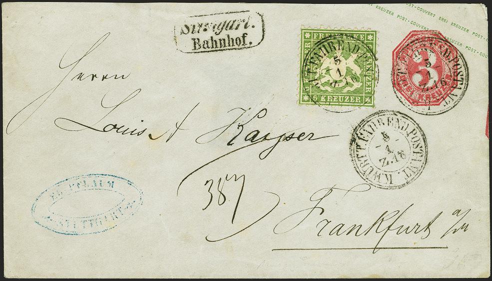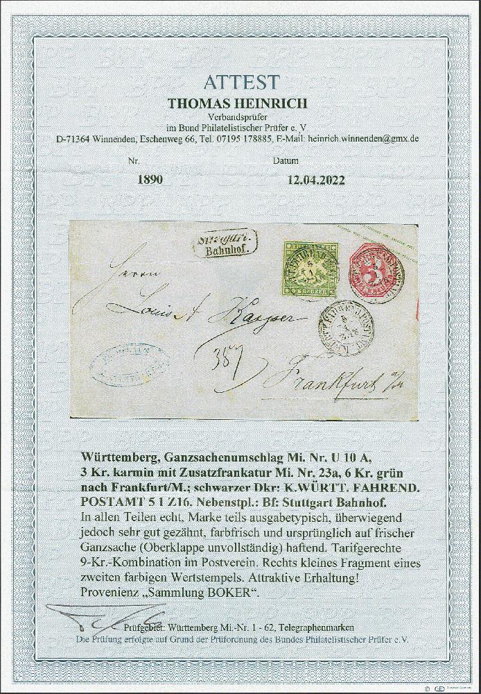 | Zusatzinformationen und Suchstichworte: | 379. Auktion Heinrich Köhler 19. - 24. September 2022 Los 291 6 Kreuzer grün, farbfrisch und teils ausgabetypisch, überwiegend jedoch sehr gut gezähnt, als Zufrankatur auf Ganzsachenumschlag 3 Kreuzer karmin (rechts mit kleinem Teil eines zusätzlichen Wertstempels), mit kleeblattförmig aufgesetzten Kreisstempeln "K:WÜRTT.FAHREND.POSTAMT 5/1 Z.16" und nebengesetztem Rahmenstempel "Stuttgart Bahnhof" nach Frankfurt am Main. Der untere Teil der Verschlussklappe beim Öffnen entfernt, sonst einwandfreie Erhaltung. Ein attraktiver Brief. Fotoattest Heinrich BPP Ausruf 200,00 EUR Zuschlag 1.400,00 EUR (aus der Sammlung Erivan Haub) |