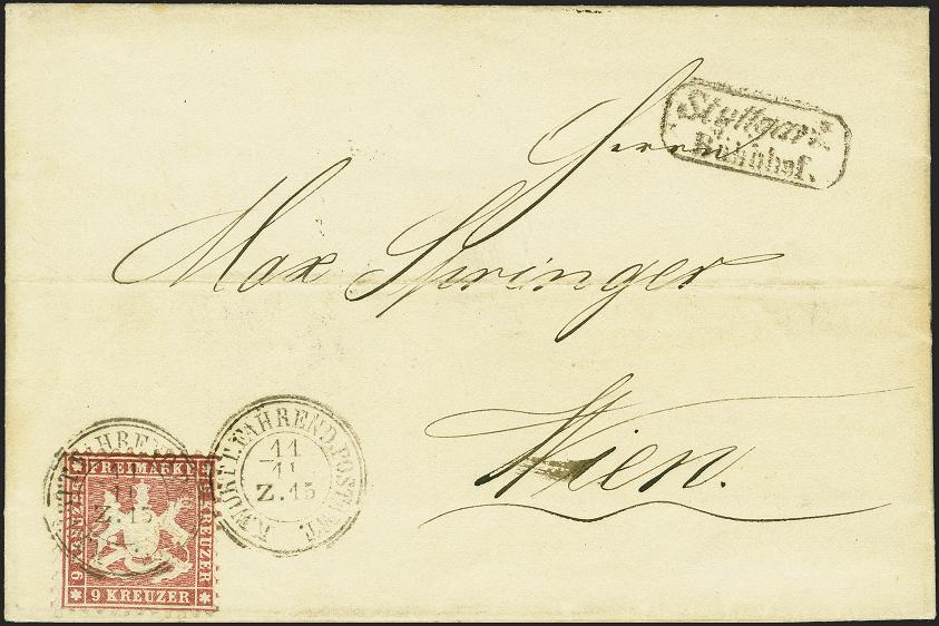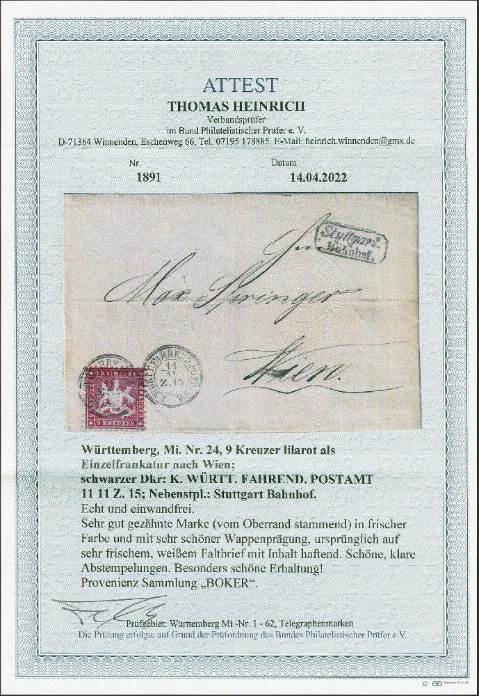 | Zusatzinformationen und Suchstichworte: | 379. Auktion Heinrich Köhler 19. - 24. September 2022 Los 292 9 Kreuzer lilarot, farbfrisch und sehr gut gezähnt, mit Kreisstempeln "K:WÜRTT.FAHREND.POSTAMT 11/11 Z.15" und nebengesetztem Rahmenstempel "Stuttgart Bahnhof" auf komplettem Faltbrief nach Wien. Eine besonders attraktive Einzelfrankatur im Wechselverkehr mit Österreich in tadelloser Erhaltung. Fotoattest Heinrich BPP (2022) Ausruf 500,00 EUR Zuschlag 1.450,00 EUR (aus der Sammlung Erivan Haub) |