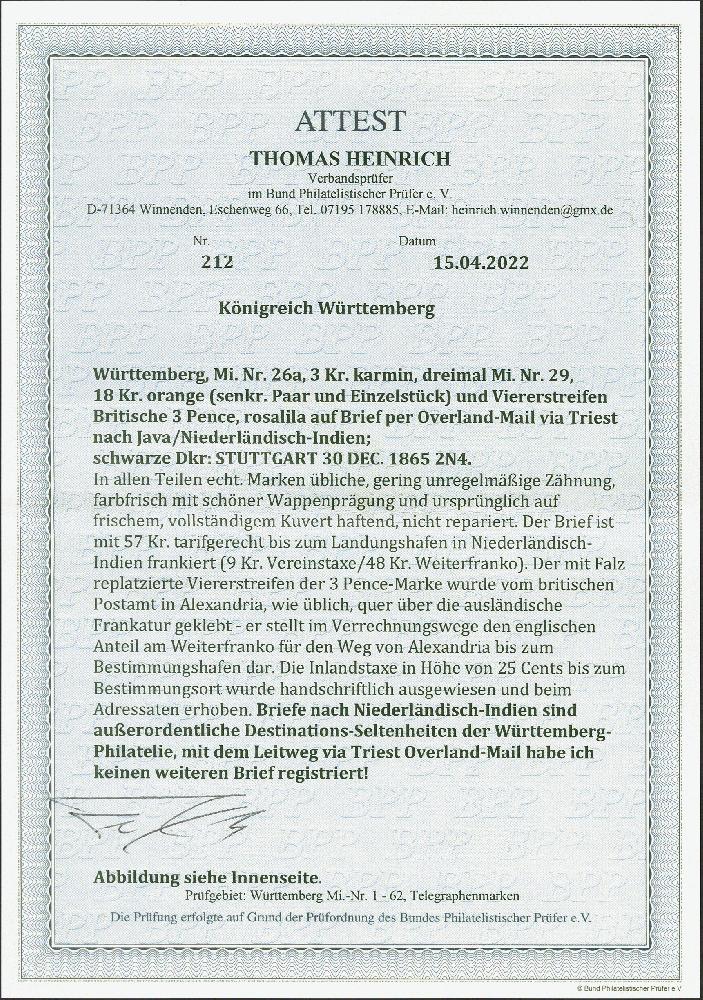 | Zusatzinformationen und Suchstichworte: | 379. Auktion Heinrich Köhler 19. - 24. September 2022 Los 293 18 Kreuzer orange, senkrechtes Paar und Einzelstück, zusammen mit drei Kreuzer karmin, alle farbfrisch, mit schöner Wappenprägung und üblich bis gut gezähnt, mit klar auf- und nebengesetztem Kreisstempel "STUTTGART 30 DEC. 1865" auf Briefkuvert über Triest, Alexandria und Singapur nach Bezoeki auf der Insel Java in Niederländisch Indien. In Alexandria wurde der Brief für den Weitertransport mit der britischen Post zusätzlich frankiert mit senkrechtem Viererstreifen Großbritannien 1865/67, 3 Pence rosa, übergehend entwertet durch "B01". Dieser Streifen wurde vor Jahrzehnten abgelöst und am Oberrand des Briefes befestigt um die württembergische Frankatur besser sichtbar zu machen; Herr Haub befestigte ihn leicht mit Falzen wieder an die ursprüngliche Stelle. Das Porto setzt sich zusammen aus 9 Kreuzern Vereinsporto, 15 österreichischen Neukreuzern Seeporto bis Alexandria und 52 Neukreuzern (= 1 britischer Shilling) britischem Porto bis Singapur. Für den Transport ab Singapur mit niederländischen Schiffen wurden vom Empfänger "25" Cents eingezogen. Rückseitig Transitstempel von Triest mit nebengesetztem "15/52" sowie rote Transitstempel von Singapur und Surabaya. Ein bemerkenswerter Brief in sehr schöner Erhaltung. Dies ist der einzig bekannte Brief von Württemberg über Triest nach Niederländisch Indien und einer der spektakulärsten Briefe der altdeutschen Staaten über die 'Overland mail'. Fotoatteste Thoma BPP (1992), van der Linden BPP (1996) und Heinrich BPP (2022) Ausruf 10.000,00 EUR Zuschlag 48.000,00 EUR (aus der Sammlung Erivan Haub) |