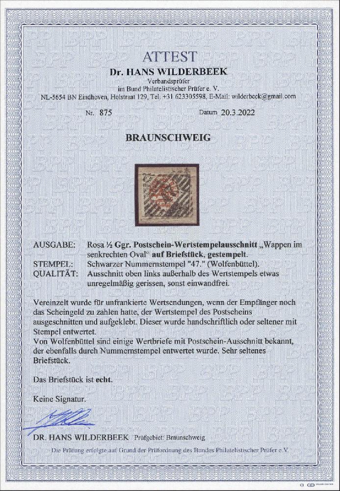| Zusatzinformationen und Suchstichworte: | 185. Dresdner Briefmarken Auktion 21.-22. September 2022 Los 864 Altdeutschland Braunschweig Postscheinausschnitt Scheingeldgebühr 1/2 Ggr. auf Briefstück mit NSt. 47 (Wolfenbüttel), Attest vom 20.3.22 "Ausschnitt oben links außerhalb des Wertstempels etwas unregelmäßig gerissen, sonst einwandfrei, sehr seltenes Briefstück" Dr. Wilderbeek BPP (6.000,-) Zuschlag 660,00 EUR |