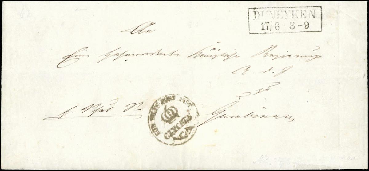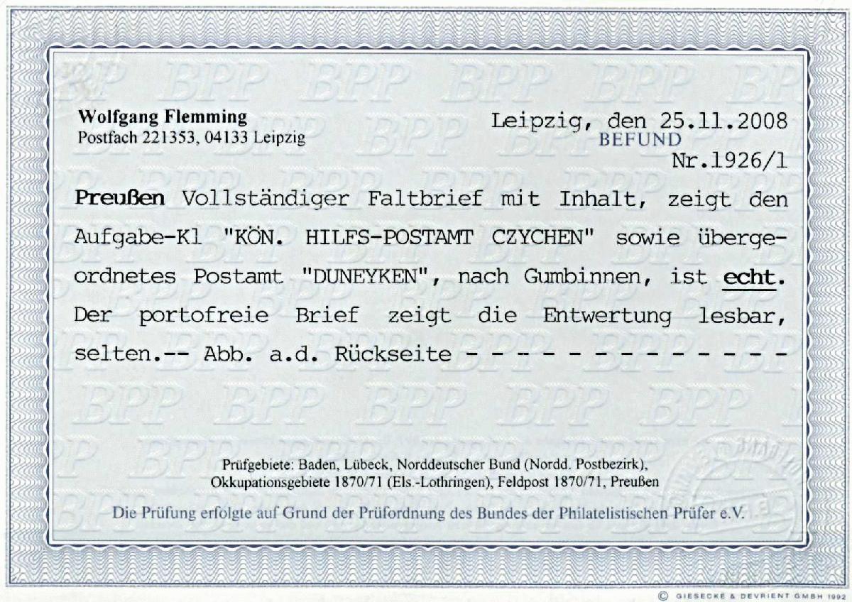 | Zusatzinformationen und Suchstichworte: | 185. Dresdner Briefmarken Auktion 21.-22. September 2022 Los 924 Altdeutschland Preussen KÖN. HILFS-POST ANST. CZYCHEN, lesbarer Abschlag des seltenen Aufgabe-K1 zusammen mit R2 des übergeordneten Postamtes DUNEYKEN 17/8 (1863) auf portofreiem Faltbrief nach Gumbinnen, AusgabeSt., Brief Faltbüge und übliche Altersspuren, Befund vom 25. 11. 08 Flemming BPP Zuschlag 135,00 EUR |