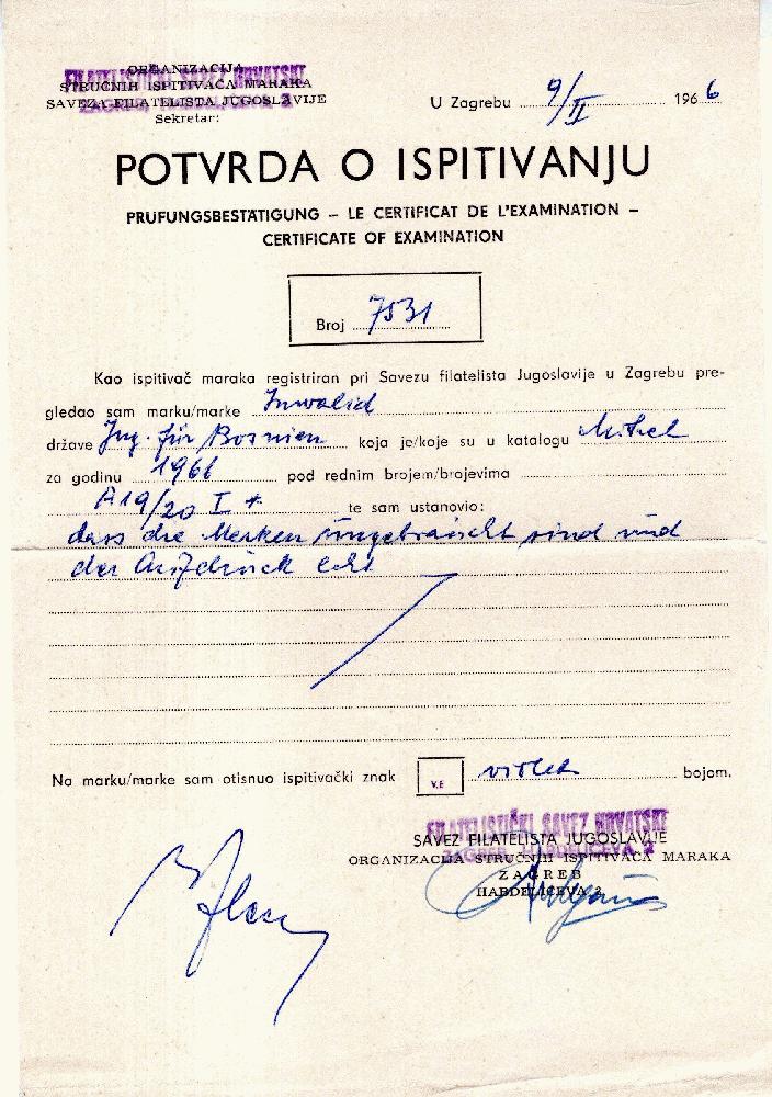 | Prüfer: | Savez Filatelista, Jugoslavije (Prüferkommission) |