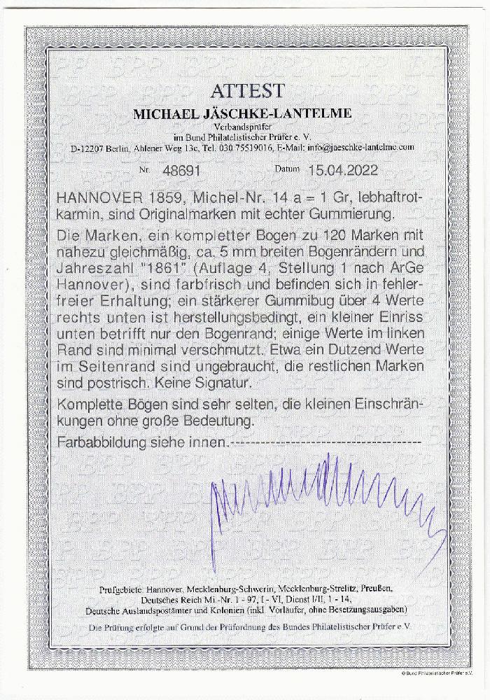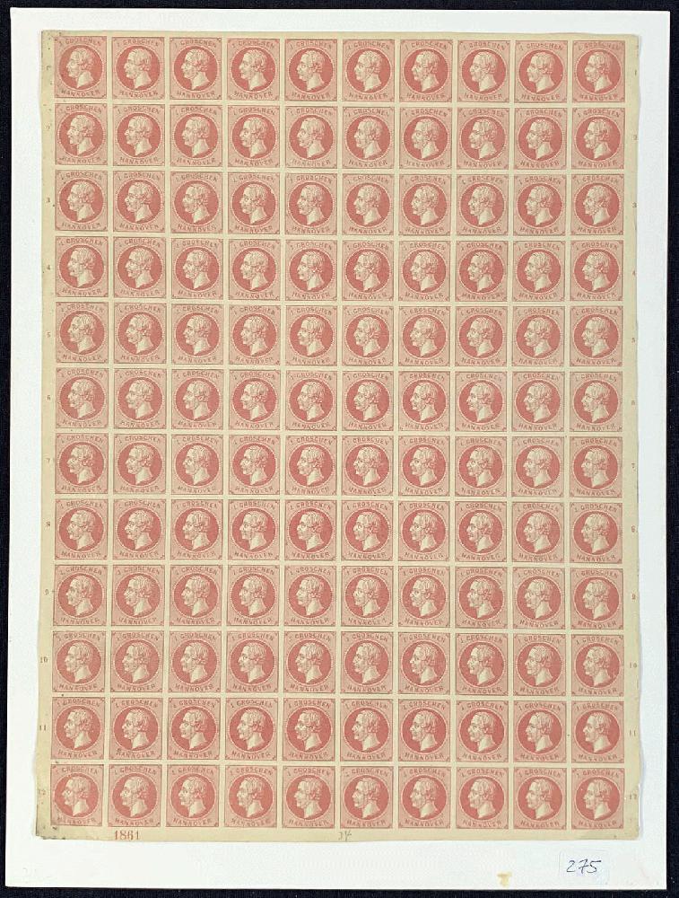 | Zusatzinformationen und Suchstichworte: | 148., 149. und 150. Teutoburger Münzauktion 12. - 16. September 2022 Los 91 Altdeutschland Hannover 1 Gr. Freimarken 1859, lebhaftrotkarmin, sind Originalmarken mit echter Gummierung. Ein kompletter Bogen zu 120 Marken mit nahezu gleichmäßig, ca. 5 mm breiten Bogenrändern und Jahreszahl ,,1861" (Auflage 4, Stellung 1 nach ArGe Hannover), sind farbfrisch und befinden sich in fehlerfreier Erhaltung; ein stärkerer Gummibug über 4 Werte rechts unten ist herstellungsbedingt, ein kleiner Einriss unten betrifft nur den Bogenrand; einige Werte im linken Rand sind minimal verschmutzt. Etwa ein Dutzend Werte im Seitenrand sind ungebraucht, die restlichen Marken sind postfrisch, unsigniert Ausruf 900,00 EUR |