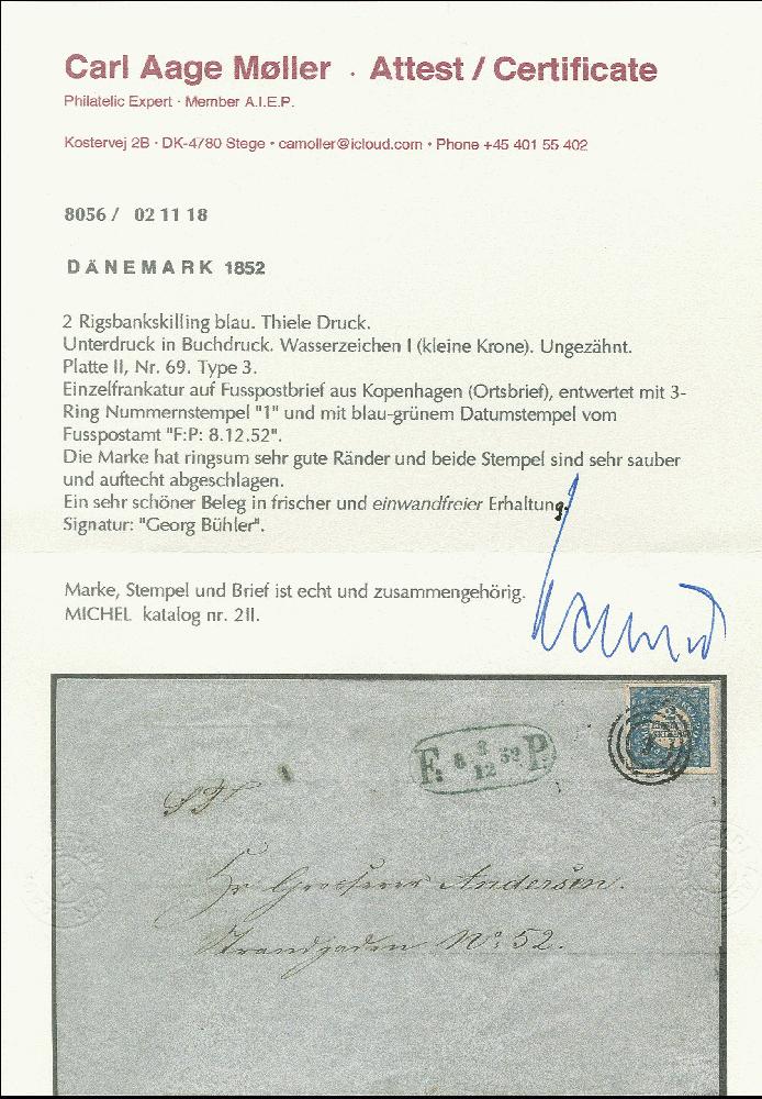 | Zusatzinformationen und Suchstichworte: | 369. Auktion Heinrich Köhler 1. Juni 2019 in Stockholm Los 512 1852, Thiele druckt 2 Skilling Blue, ein großrandiges Exemplar, gebunden durch die klare Ziffer "1" an lokal adressierten Briefbogen mit klarer angrenzender bläulich-grüner ovaler Fußpfostenmarkierung vom 8. Dezember 1852. Ein sehr feines und attraktives Ganzes. Zertifikate BPA (1968) und C.A. Møller AIEP (2018) Ausruf 500,00 EUR Zuschlag 750,00 EUR (aus der Sammlung Erivan Haub) |