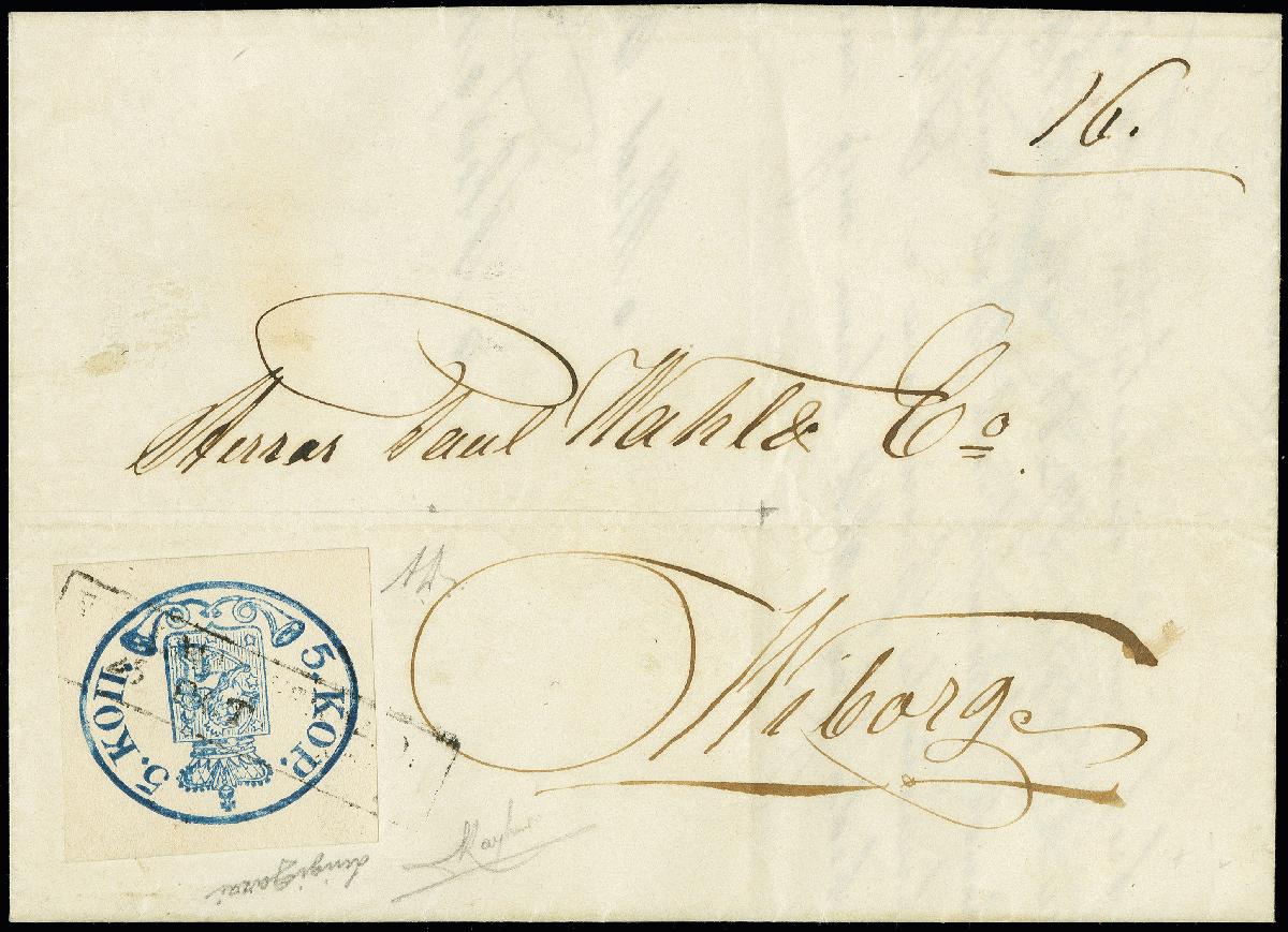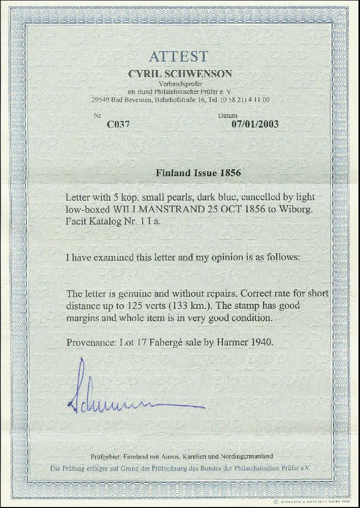 | Zusatzinformationen und Suchstichworte: | 369. Auktion Heinrich Köhler 1. Juni 2019 in Stockholm Los 518 1856, Small pearls 5 kopeks dark blue with nice margins on all sides, tied by rare boxed "WILLMANSTRAND 25 OCT 1856" to entire letter to Wiborg. An attractive and rare letter with a beautiful stamp with sole postmark cancellation. 3 signatures in pencil including Alberto Diena and certificate Schwenson BPP (2003) Ausruf 4.000,00 EUR Zuschlag 3.700,00 EUR (aus der Sammlung Erivan Haub) |