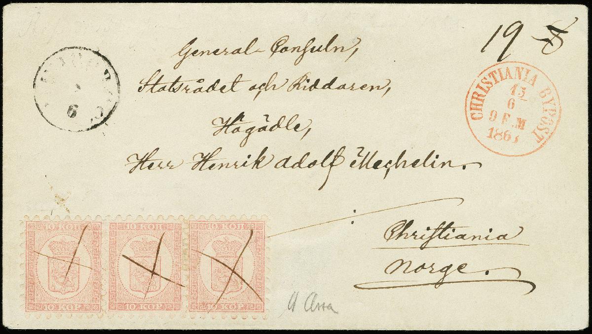 | Zusatzinformationen und Suchstichworte: | 369. Auktion Heinrich Köhler 1. Juni 2019 in Stockholm Los 526 1860, 10 kopeks rose, roulette A, horizontal strip of 3 in brilliant shade, each value cancelled by pen cross on envelope with departure cds. "WIBORG 8/6 1863" via Stockholm (June 12) to Christiania, Norway with clear red arrival mark on front. A very fine and rare cover, signed Ossa in pencil, certificate Tuori (2003) and Schwenson BPP (2018) (Facit 4C1Kb) Ausruf 2.000,00 EUR Zuschlag 3.600,00 EUR (aus der Sammlung Erivan Haub) |