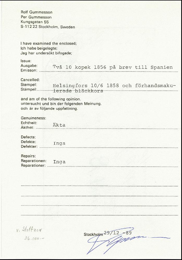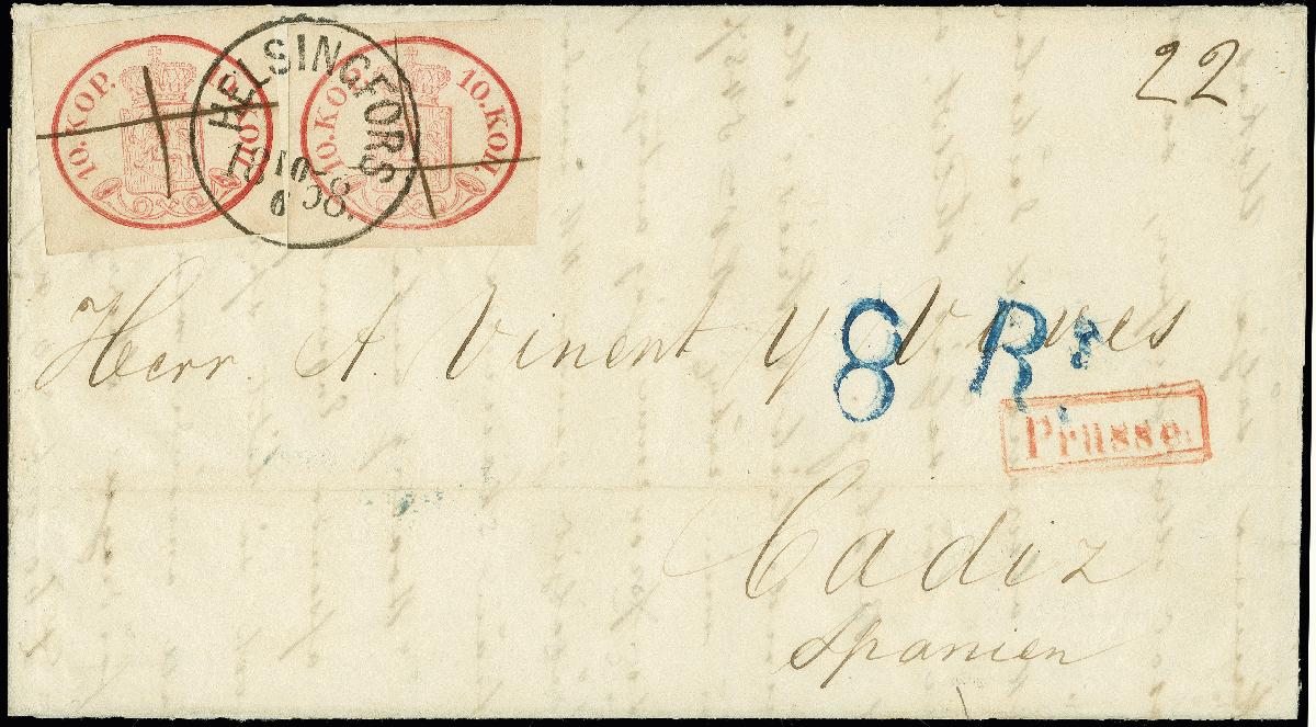 | Zusatzinformationen und Suchstichworte: | 369. Auktion Heinrich Köhler 1. Juni 2019 in Stockholm Los 521 1856, 10 kopeks carmine-red on wove paper, 2 large margined copies in nice deep shade, cancelled by concentric pen crosses and tied by superb "HELSINGFORS 10 6 1858" to lettersheet via Prussia and France to Cadiz, Spain with frontside red boxed "Prusse" and on reverse arrival mark of June 24. The postage paid the distance to the Spanish border, here an additional "8 Rs." (reales) were charged to the recipient. A filing crease in the lower part of the entire, well off the franking has been cleaned and ironed (mentioned for accuracy only). A most attractive and extremely rare letter to abroad. Opinion Gummesson (1989) and certifcate Schwenson BPP (2018) (Facit 2e) Ausruf 5.000,00 EUR Zuschlag 5.000,00 EUR (aus der Sammlung Erivan Haub) |