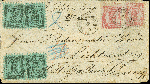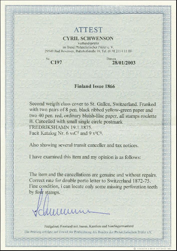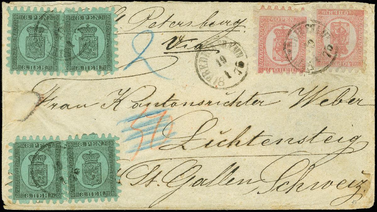 | Zusatzinformationen und Suchstichworte: | 369. Auktion Heinrich Köhler 1. Juni 2019 in Stockholm Los 528 1866, 8 penni black on green, 2 horizontal pairs with 2 copies 40 penni rose on bluish paper, used with small "FREDERIKSHAMN 19 1 1875" on double rate envelope to Lichtensteig near St. Gallen in Switzerland with arrival mark on reverse (January 23). Very fresh and fine, the 40 penni stamps and one 8 penni with few short/pulled perfs. A scarce combination from a wellknown correspondance. Certificate Schwenson BPP (2003) (Facit 6v4C2, 9v3C2) Ausruf 800,00 EUR Zuschlag 1.400,00 EUR (aus der Sammlung Erivan Haub) |