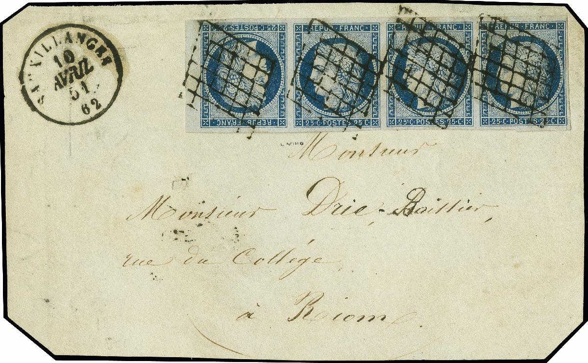 | Zusatzinformationen und Suchstichworte: | 369. Auktion Heinrich Köhler 1. Juni 2019 in Stockholm Los 530 1850, Ceres 25 centimes dark blue, horizontal marginal strip of 4 including tête-bêche pair at left, nice deep and fresh colour and good to mostly large margins, showing about 3 mm sheet margin next to the tête-bêche, tied by clear grid cancels to letterfront with adjacent cds. "SAUXILLANGES 10 AVRIL 51" addressed to Riom. The strip with 3 small scissors' cuts in the two right interspaces and one slightly into the design of the right stamp at bottom right, the tête-bêche pair absolutely flawless. A highly attractive and rare multiple. Signed Miro and certificate Behr (2007) Ausruf 3.000,00 EUR (aus der Sammlung Erivan Haub) |