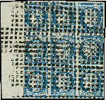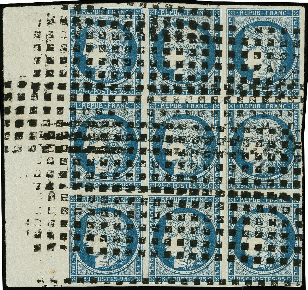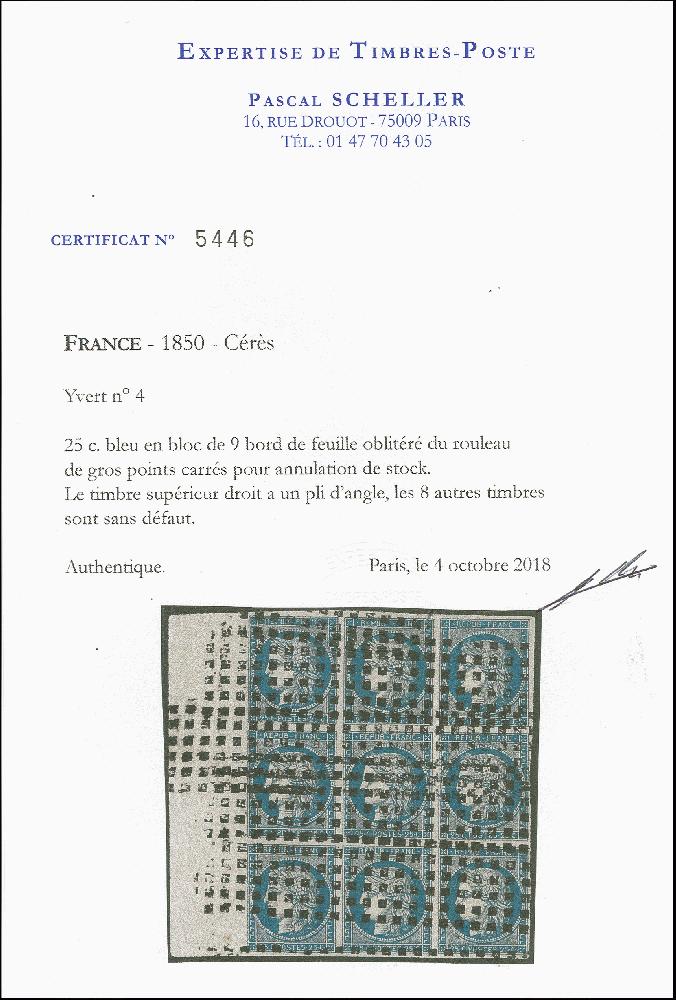 | Zusatzinformationen und Suchstichworte: | 369. Auktion Heinrich Köhler 1. Juni 2019 in Stockholm Los 531 1850, Ceres 25 centimes blue in block of 9, nice fresh colour and good to mostly wide margins with enormous 16/17 mm sheet margin at left, neatly cancelled by "gros points". Some light natural gum creasing, the upper right stamp with light small diagonal corner crease (not visible from front). An attractive and scarce multiple in fine condition. Signed Calves, opinion Robineau (1968) and signed Scheller with his certificate (2018) (Yvert 4) Ausruf 1.000,00 EUR Zuschlag 2.200,00 EUR (aus der Sammlung Erivan Haub) |
