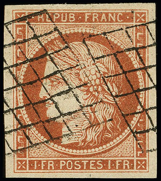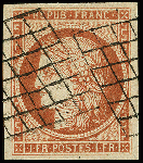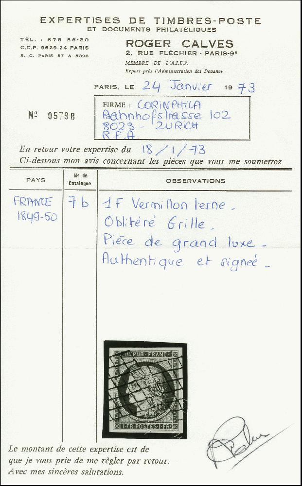 | Zusatzinformationen und Suchstichworte: | 369. Auktion Heinrich Köhler 1. Juni 2019 in Stockholm Los 534 1849, Ceres 1 franc vermillion terne in a very nice vivid shade and with large margins on all sides, cancelled very attractively with 2 parallel strikes of grid cancel. A marvellous copy of this rare stamp in superb condition. Signed A. Diena and Brun and also R. Calves with his certificate (1973) (Yvert 7b) Provenance: 56. Corinphila auction (1973) Ausruf 4.000,00 EUR Zuschlag 9.500,00 EUR (aus der Sammlung Erivan Haub) |