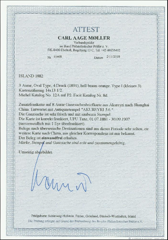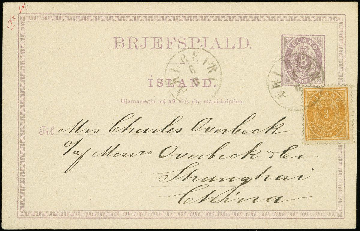 | Zusatzinformationen und Suchstichworte: | 369. Auktion Heinrich Köhler 1. Juni 2019 in Stockholm Los 548 1882/98, 3 aurar brownish orange, 4th printing 1891, perf. 14:13½, used on postal stationery card 8 aurar violet, tied by cds. "AKUREYRI 5/6" (1892) and adressed to Shanghai, China, with Hongkong arrival mark (September 20, 1892) and short greetings text. A very fine and rare card to abroad with most unusual destination. According to certificate of C.A. Møller BPP (2018) just one further card to China has been recorded (from the same correspondance). Ausruf 1.000,00 EUR Zuschlag 3.600,00 EUR (aus der Sammlung Erivan Haub) |