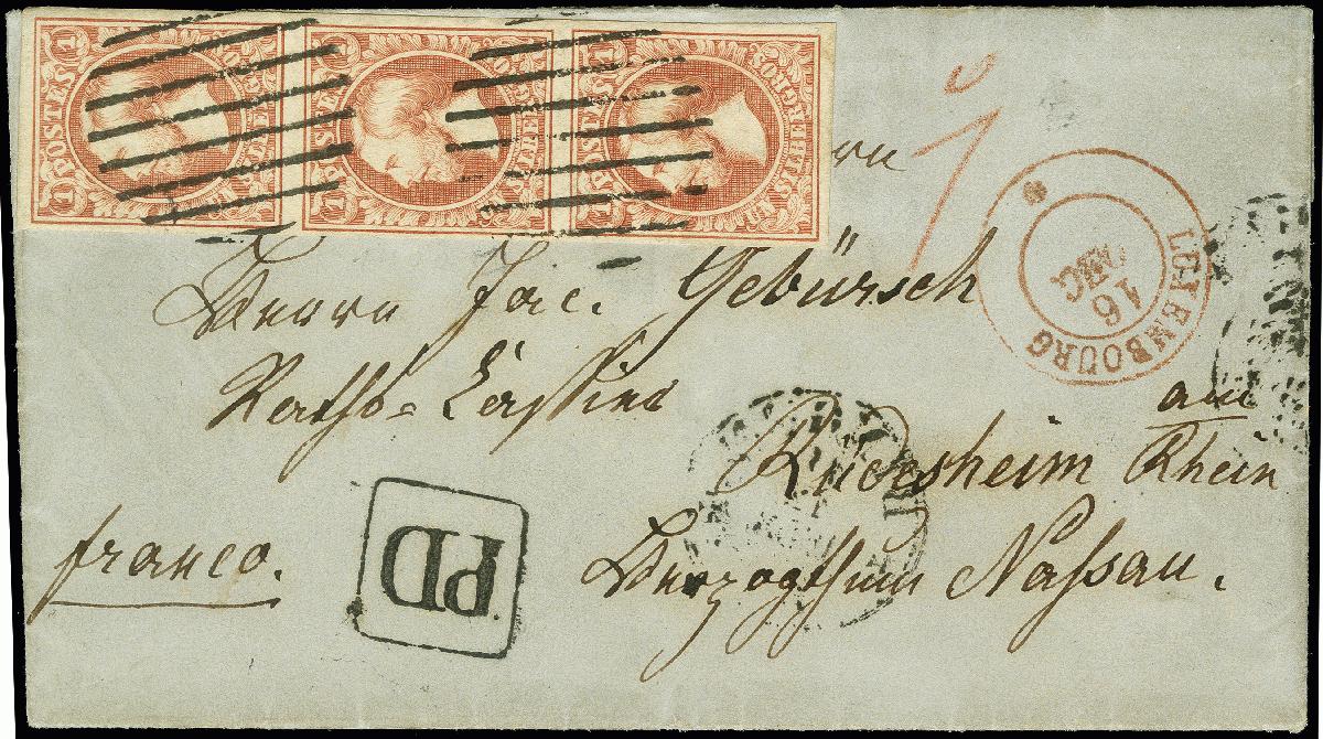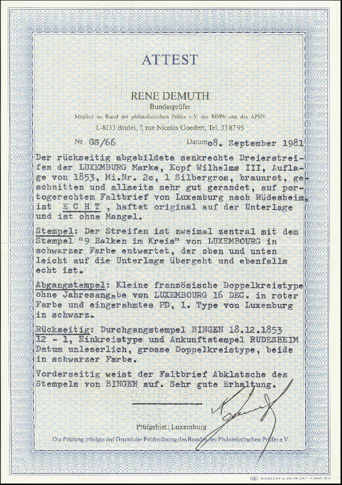 | Zusatzinformationen und Suchstichworte: | 369. Auktion Heinrich Köhler 1. Juni 2019 in Stockholm Los 549 1852, William III 1 silbergroschen brownish-red (1853) in vertical strip of 3 with nice fresh colour and ample to large margins, tied by circle of 9 bars to small entire letter with adjacent red "LUXEMBOURG 16 DEC." to Rüdesheim in the Duchy of Nassau with transit and arrival marks. A fine and scarce letter. Certificate Demuth BPP (1981) Ausruf 500,00 EUR Zuschlag 3.200,00 EUR (aus der Sammlung Erivan Haub) |