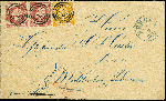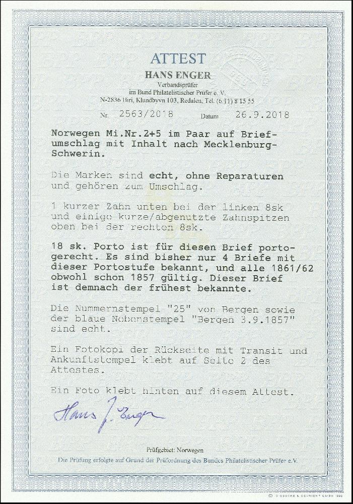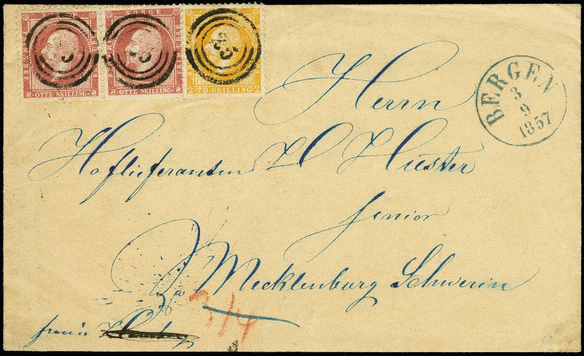 | Zusatzinformationen und Suchstichworte: | 369. Auktion Heinrich Köhler 1. Juni 2019 in Stockholm Los 553 1856/57, Oskar 2 skilling orange-yellow and 8 skilling carmine in horizontal pair, used with numeral "25" on cover from Bergen (Sep 3, 1857) with full contents to Mecklenburg-Schwerin. The letter is fully paid; the original endorsement "franco Hamburg" was changed in "franco". The franking slightly afixed over the top edge of the cover, but except of 2 shortish perfs of the right 8 skilling in fine condition. The earliest of just 4 recorded entires with the 18 skilling rate to Mecklenburg. Certificate Enger BPP (2018) Ausruf 800,00 EUR Zuschlag 3.000,00 EUR (aus der Sammlung Erivan Haub) |
