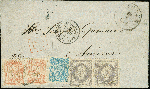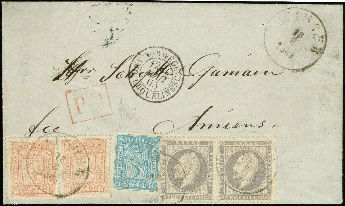 | Zusatzinformationen und Suchstichworte: | 369. Auktion Heinrich Köhler 1. Juni 2019 in Stockholm Los 555 1856/57, Oskar 3 skilling grey-violet in combination with 1863/67, coat of arms 4 skilling blue and horizontal pair 8 skilling rose, tied by cds. "RIISØER 18 8 1865" to lettersheet with transit marks "SANDØSUND 19 8 1865" and "NORWÈGE AMB. ERQUELINES" to Amiens, France. The 3 skilling stamps few short perf tips, otherwise very fine and fresh. Just 4 entires recorded with this franking. Certificate Enger BPP (2018) Ausruf 800,00 EUR Zuschlag 1.000,00 EUR (aus der Sammlung Erivan Haub) |