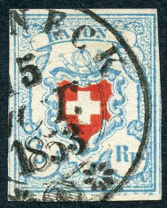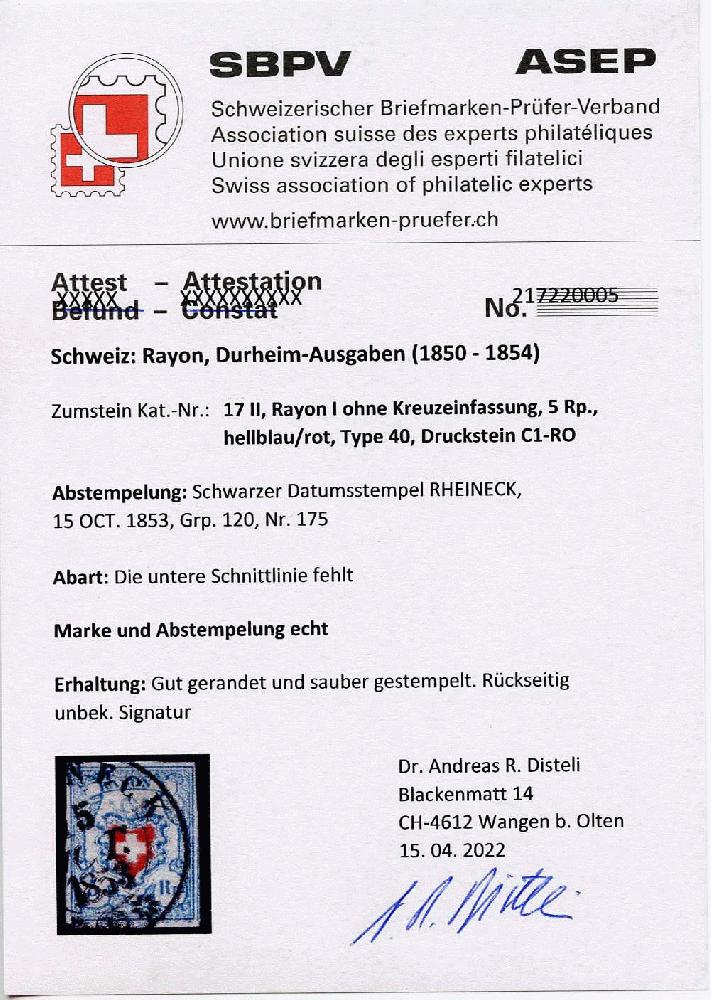 | Zusatzinformationen und Suchstichworte: | 71. Forster Philatelie Auktion 15. Oktober 2022 Los 125 Rayon I, hellblau, ohne KE (STEIN C1) RAYON I, HELLBL. OHNE KE (STEIN C1) T. 40 C1-RO, mit fehlender Randlinie unten, weissrandig und sauber mit Zierstempel RHEINECK (AW 5244), rückseitig mittig minim rauhe Stelle. Attest Dr. Disteli Ausruf 100,00 CHF |