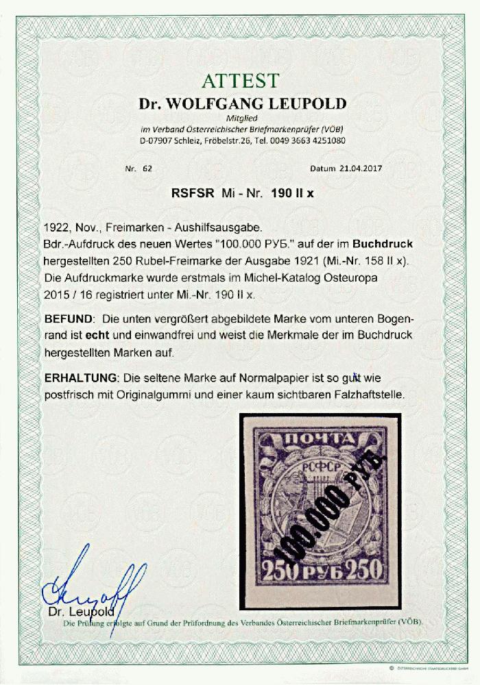 | Zusatzinformationen und Suchstichworte: | 185. Dresdner Briefmarken Auktion 21.-22. September 2022 Los 703 Russland 100.000 R. auf 250 R. Buchdruck statt Steindruck, ungebraucht mit minimaler Falzhaftstelle, Attest vom 21.4.17 Dr. Leupold, selten Ausruf 100,00 EUR |