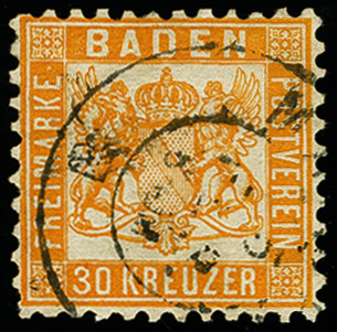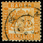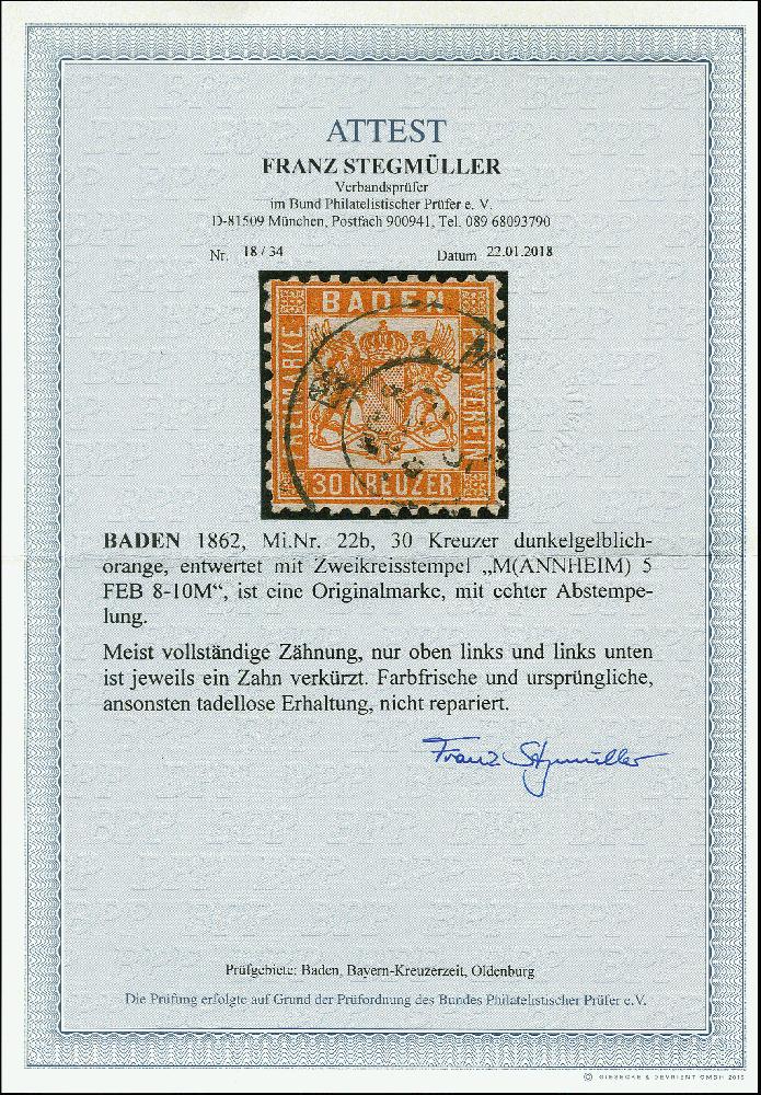 | Zusatzinformationen und Suchstichworte: | 366. Auktion Heinrich Köhler Auktionstermin 19.–24.03.2018 Los 2541 30 Kr. dunkelgelblichorange, sehr schön farbfrisch und bis auf 2 verkürzte Zähne links oben und unten gut gezähnt und einwandfrei, leicht entwertet durch DKr. von Mannheim, Fotoattest Stegmüller BPP (2018) (Mi. 3.200,-) Zuschlag 480,00 EUR |