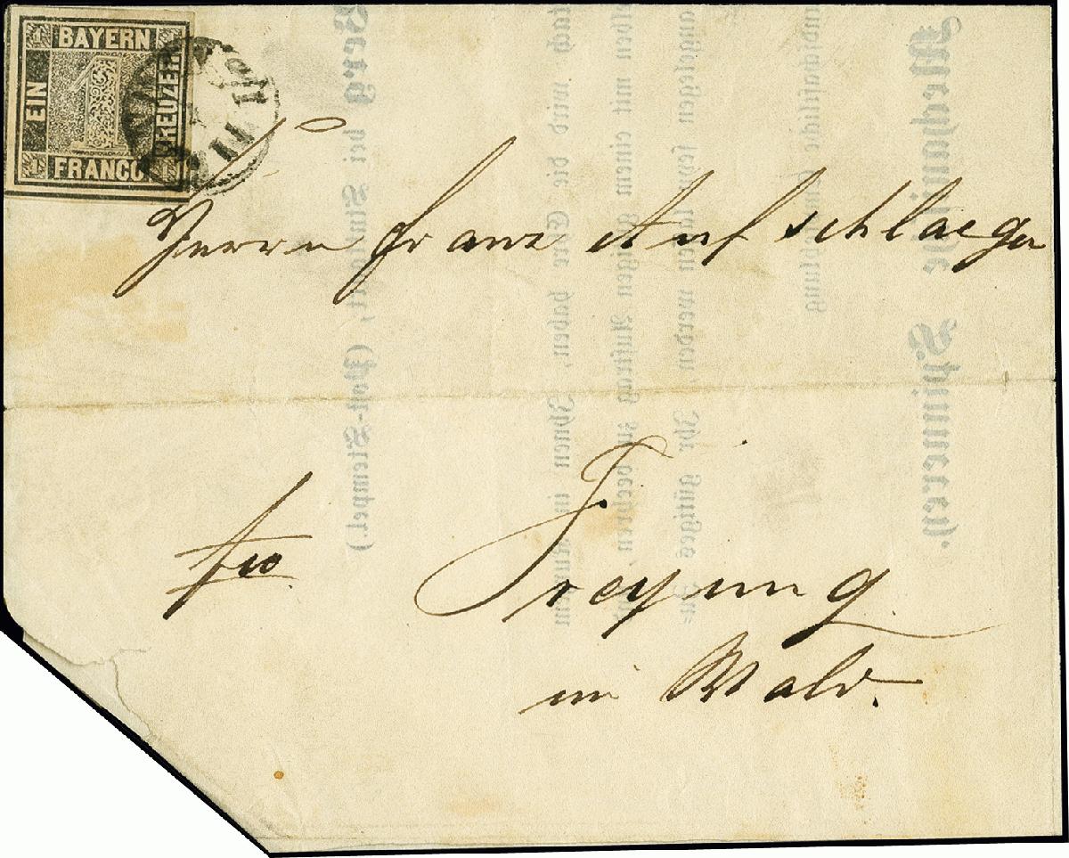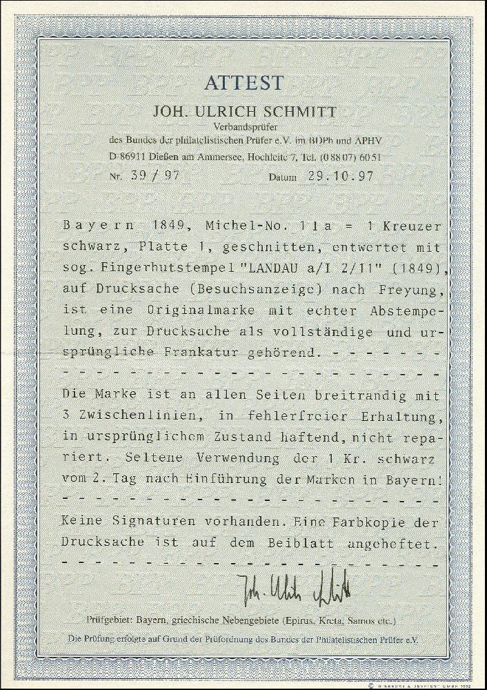 | Zusatzinformationen und Suchstichworte: | 366. Auktion Heinrich Köhler Auktionstermin 19.–24.03.2018 Los 2552 1 Kr. schwarz, Platte 1, farbfrisch und allseits breitrandig mit Zwischenlinien an 3 Seiten, übergehend entwertet durch Fingerhutstempel "LANDAU a/I 2/11 (1849)" auf vollständiger Drucksache (Besuchsanzeige) nach Freyung; die Drucksache war verbotenerweise unten links rückseitig durch Siegel verschlossen (daher Ecke umgelegt), jedoch unbeanstandet befördert; möglicherweise waren die Beamten zu diesem frühen Zeitpunkt mit den Regularien noch nicht so vertraut. Ein außerordentlich seltener Brief vom 2. Verwendungstag der Freimarken, Fotoattest Schmitt BPP (1997) Zuschlag 15.000,00 EUR |