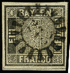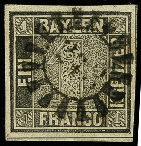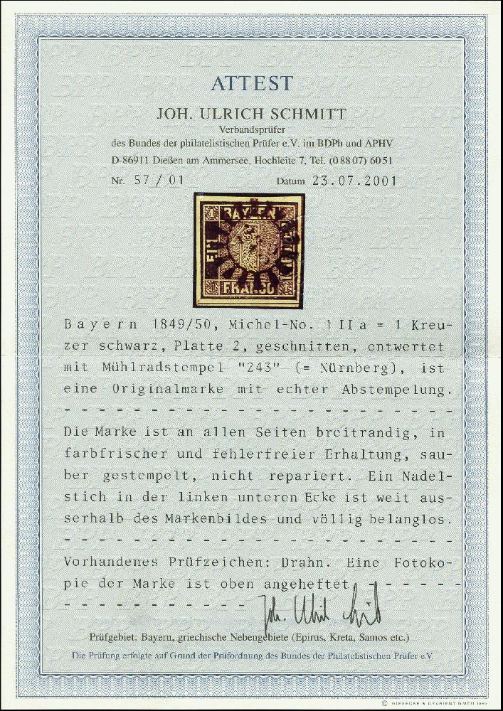 | Zusatzinformationen und Suchstichworte: | 366. Auktion Heinrich Köhler Auktionstermin 19.–24.03.2018 Los 2557 "243" NÜRNBERG, zentrisch auf 1 Kreuzer schwarz, Platte 2, allseits breitrandig mit Zwischenlinien unten und rechts; belangloser kleiner Nadelstich links unten außerhalb des Markenbildes, sign. Drahn und Fotoattest Schmitt BPP Zuschlag 900,00 EUR |