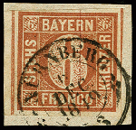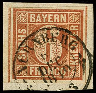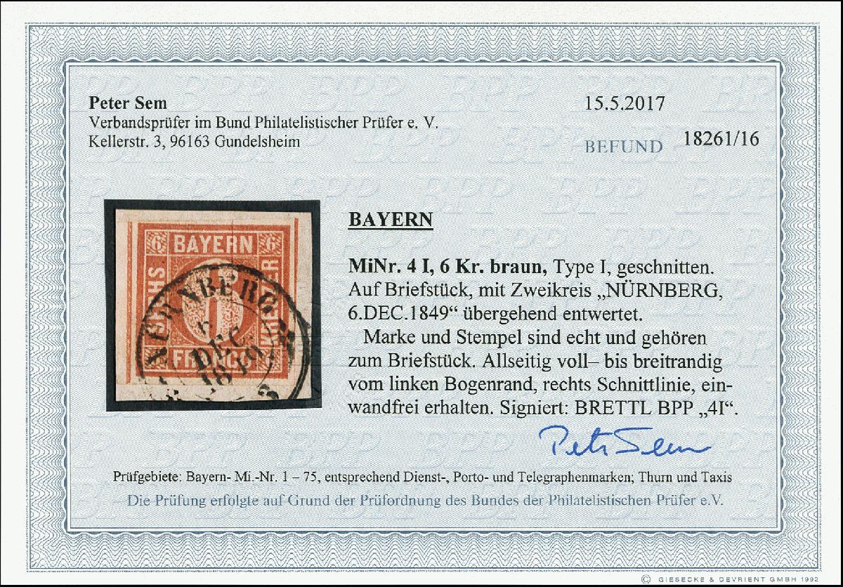 | Zusatzinformationen und Suchstichworte: | 366. Auktion Heinrich Köhler Auktionstermin 19.–24.03.2018 Los 2579 6 Kr. braunorange, voll- bis überrandig, links mit ca. 1,5 mm Bogenrand, mit alleiniger Entwertung durch klaren DKr. "NÜRNBERG 6 DEC. 1849" auf Briefstück, Kabinett, sign. Brettl BPP und Fotobefund Sem BPP (2017) Zuschlag 110,00 EUR |
