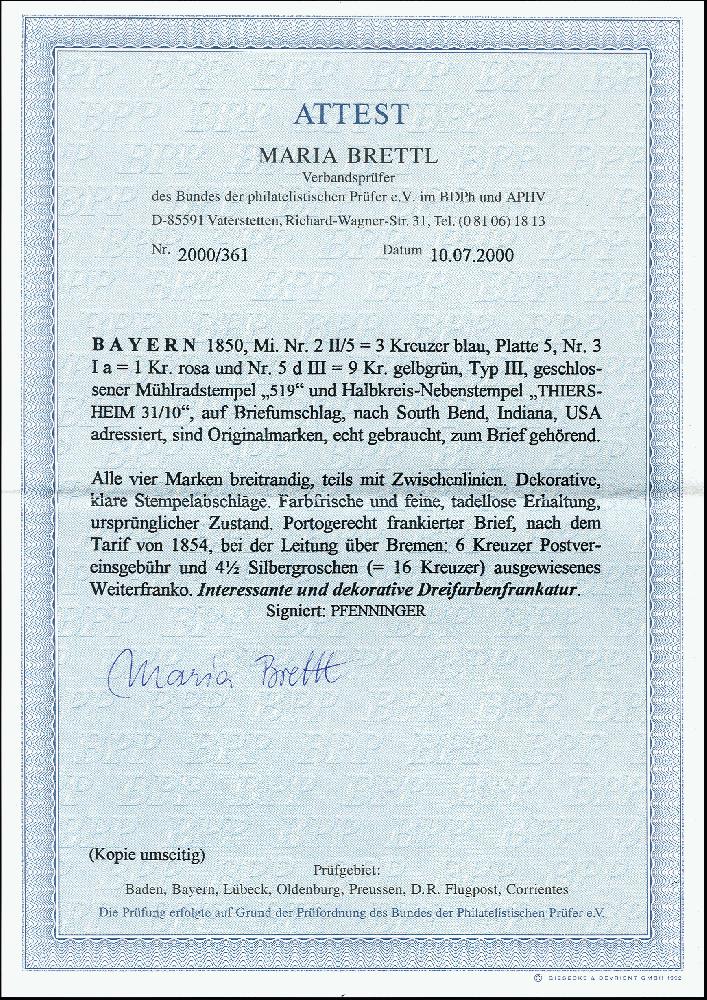| Zusatzinformationen und Suchstichworte: | 366. Auktion Heinrich Köhler Auktionstermin 19.–24.03.2018 Los 2647 1850/58, 1 Kreuzer rosa, 3 Kreuzer blau und 2 Einzelwerte 9 Kreuzer gelbgrün, alle farbfrisch und breitrandig, teils mit Zwischenlinien, mit klarem gMR "519" und nebengesetztem Halbkreisstempel "THIERSHEIM 31/10" auf kleinem Briefkuvert über Bremen mit rückseitigem Durchgangsstempel des Stadtpostamtes nach South Bend, Indiana; ein äußerst attraktiver Transatlantik-Brief, signiert Pfenninger und Fotoattest Brettl BPP Zuschlag 2.200,00 EUR |